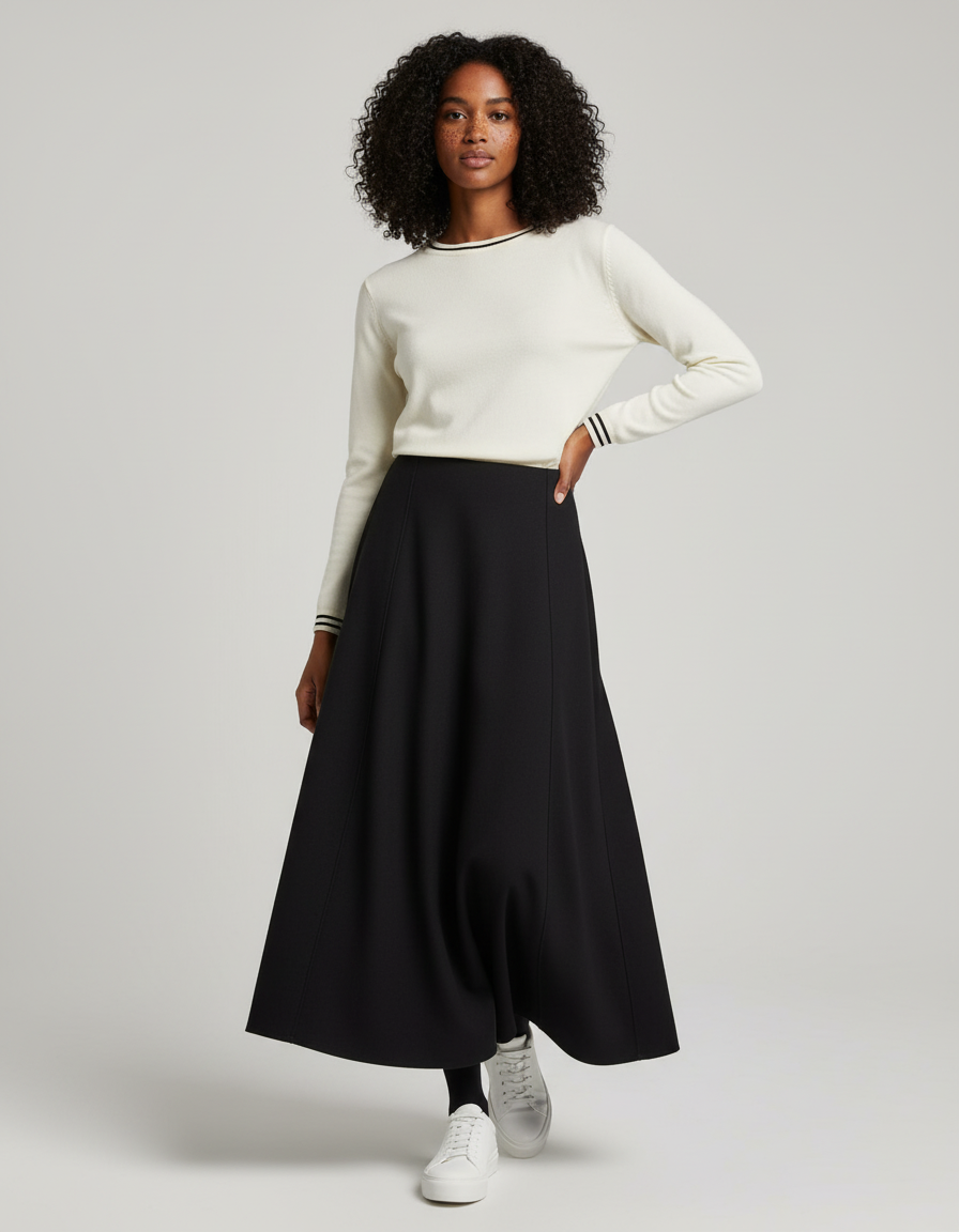 Sa polyvalence en fait une pièce maîtresse pour toutes les occasions. Adoptez un style décontracté et raffiné en l'associant à un pull léger et des baskets épurées, comme illustré. Pour une soirée élégante, mariez-la à un top en soie et des escarpins, tandis qu'au bureau, un chemisier structuré et un blazer créeront une tenue professionnelle et chic. La Jupe Fluide Noire est l'investissement idéal pour une garde-robe qui allie intemporalité, modernité et adaptabilité.