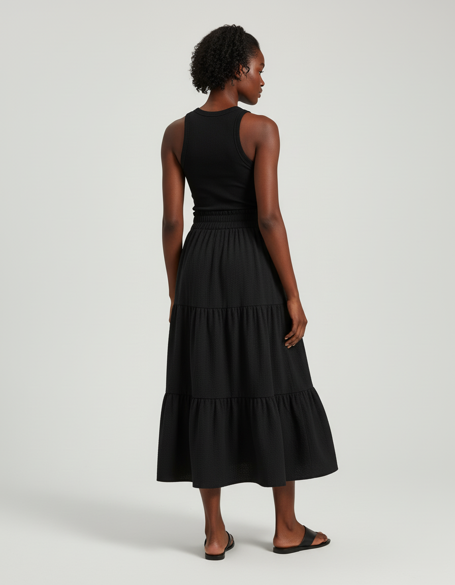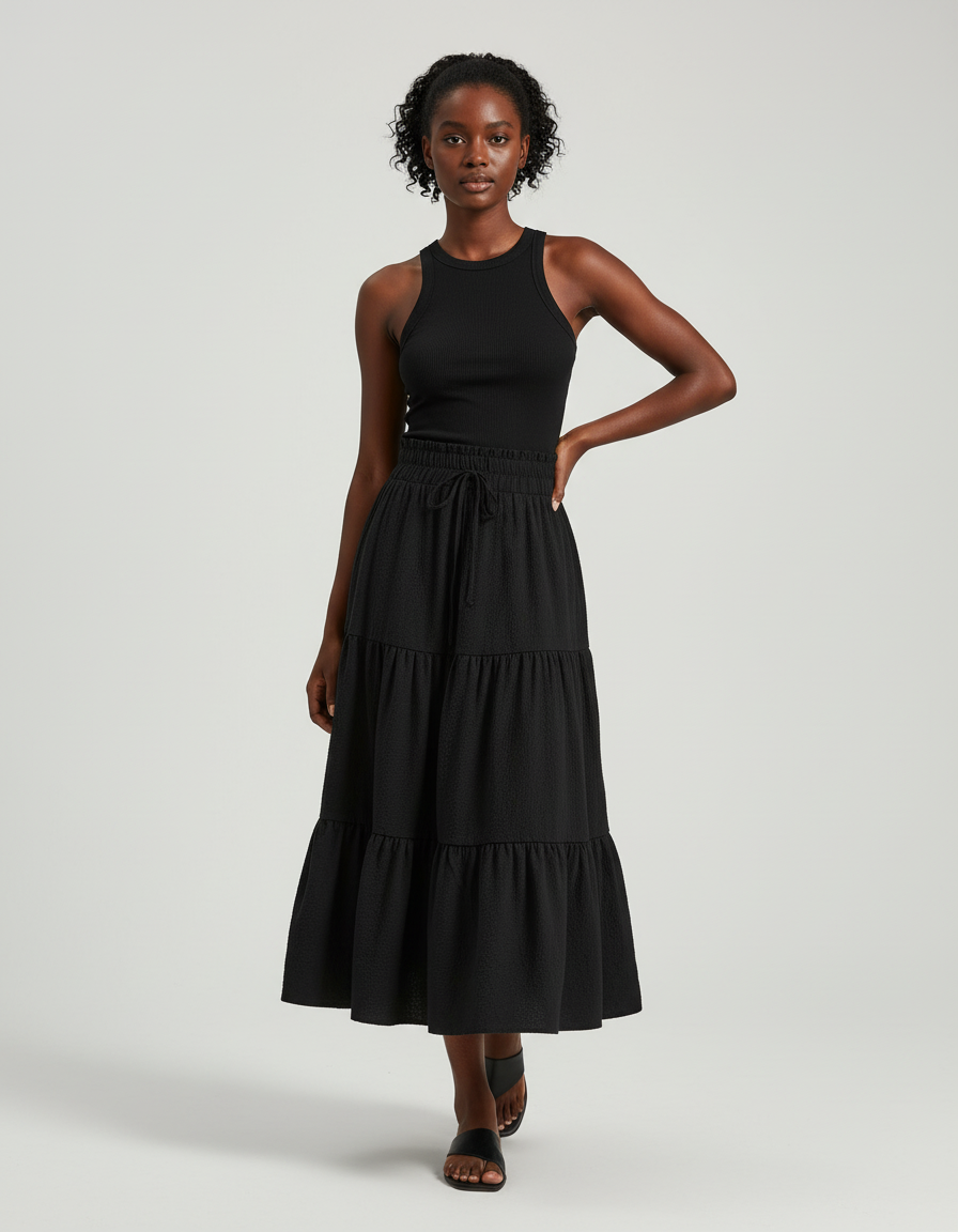 A woman with dark skin and dark, curly hair is standing against a plain light grey background, looking directly at the camera. She is wearing a sleeveless, all-black outfit. Her top is a fitted black ribbed tank top with a high, rounded neckline and racerback-style straps. The fabric has a visible vertical ribbing texture. She is wearing a high-waisted, tiered black maxi skirt. The waistband is elasticized and gathered, creating a ruffled effect, and features a drawstring tie in the front. The skirt consists of multiple gathered tiers, giving it a full and flowing silhouette. The fabric of the skirt appears to have a subtle, all-over textured or puckered pattern. On her feet, she is wearing simple black flat sandals with a wide strap across the toes and a thong-style strap between her big toe and second toe. She has one hand on her hip, and her other arm is relaxed at her side.
