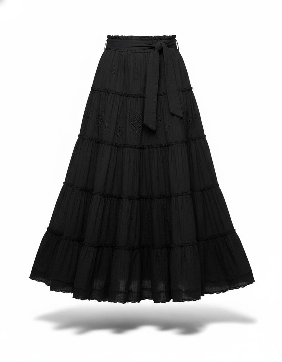 Cette jupe longue de couleur noire est fabriquée en coton et lin. Elle présente une coupe évasée avec des volants en plusieurs couches et une longueur de 90 cm.