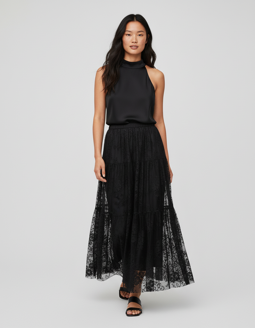 Sa polyvalence est son atout majeur. Pour un look bohème chic en journée, associez-la à un débardeur simple et des sandales plates. En soirée, transformez-la en une tenue spectaculaire en l'associant à un caraco en satin noir et des talons élégants, comme le modèle présenté. Ajoutez quelques bijoux fins pour rehausser son caractère sophistiqué. La Jupe Longue Noire Gitane s'adapte à toutes les occasions, vous offrant une infinité de possibilités pour exprimer votre style personnel avec une touche de raffinement intemporel.