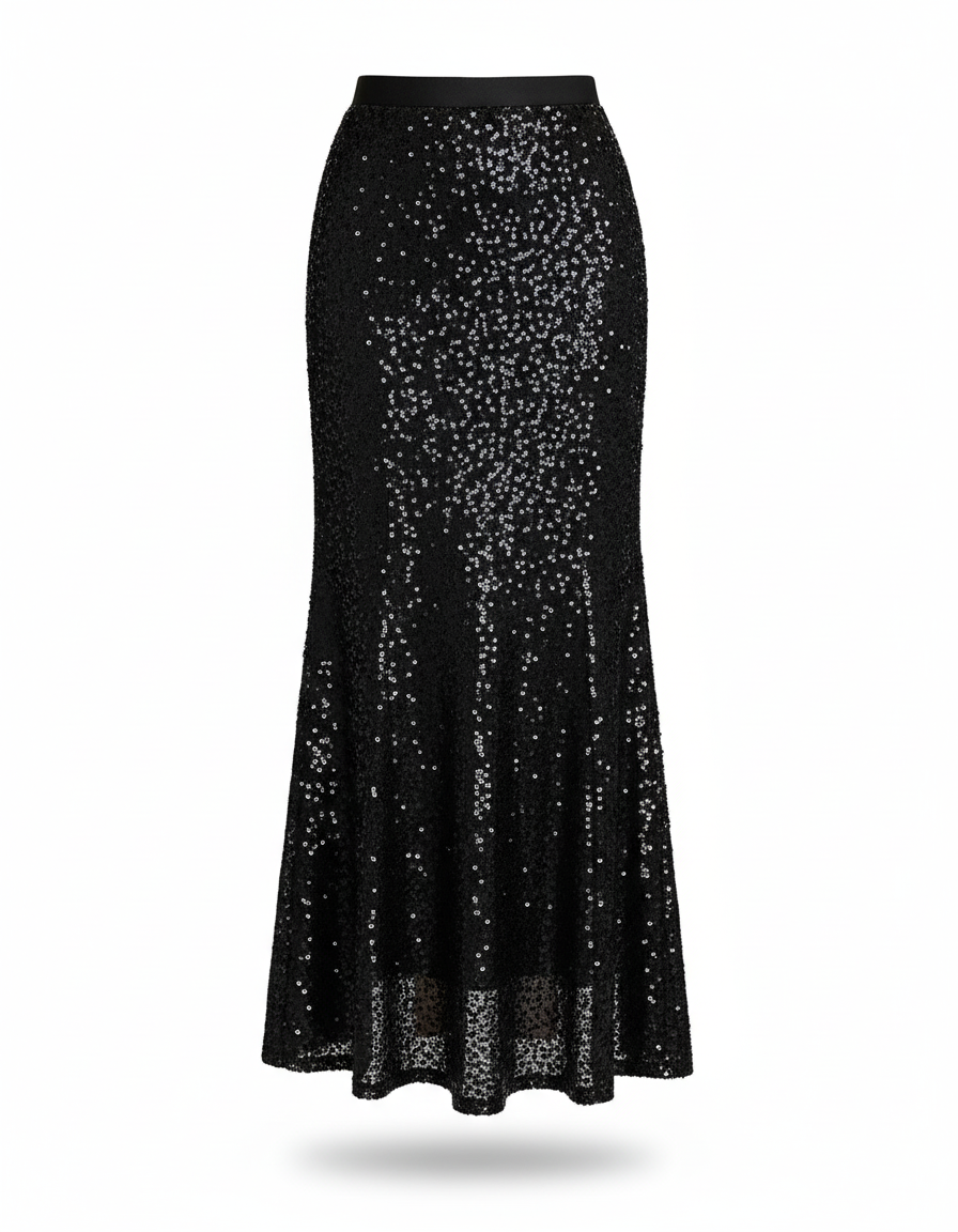 Sublimez votre look de soirée avec cette jupe longue noire entièrement pailletée, alliant glamour et confort.