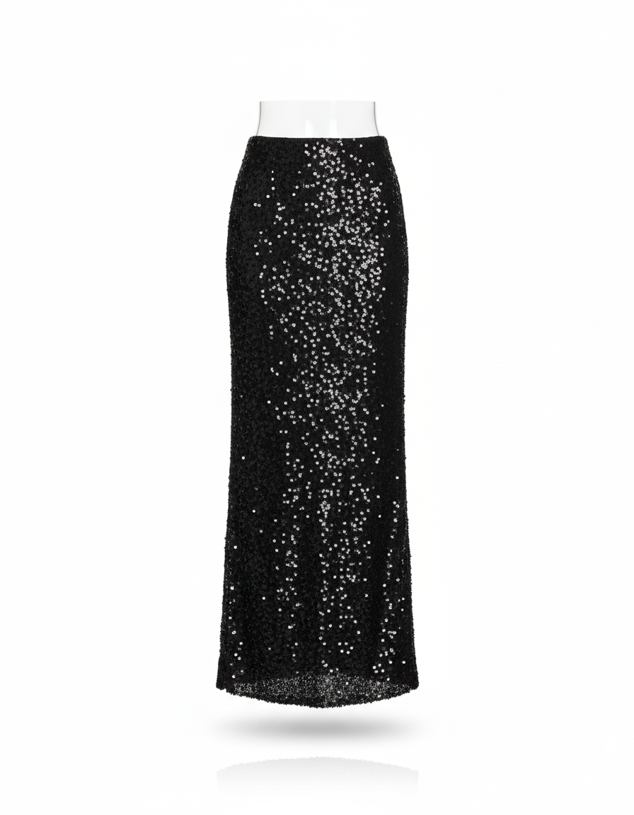 Ajoutez une touche de glamour à votre garde-robe avec notre jupe longue noire à paillettes, parfaite pour des soirées inoubliables.