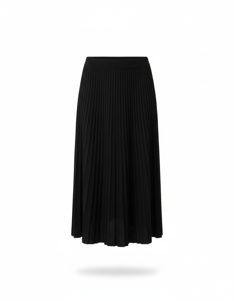 Ce qui distingue notre jupe, c'est son plissé impeccable qui conserve sa tenue, ainsi que la qualité exceptionnelle de sa maille noire profonde, facile à entretenir et résistante. Loin des tendances éphémères, elle représente un investissement mode durable, capable de transformer n'importe quelle tenue, d'un pull douillet à un chemisier de soie. Optez pour cette jupe et faites l'expérience d'un luxe concret : une pièce versatile, confortable et d'une beauté intemporelle qui vous accompagnera saison après saison, faisant d'elle un essentiel de votre dressing.