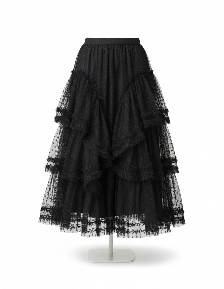 Cette jupe longue est de couleur noire et présente plusieurs niveaux de volants. Elle est dotée d'une taille élastique et d'un tissu transparent avec un motif à pois.