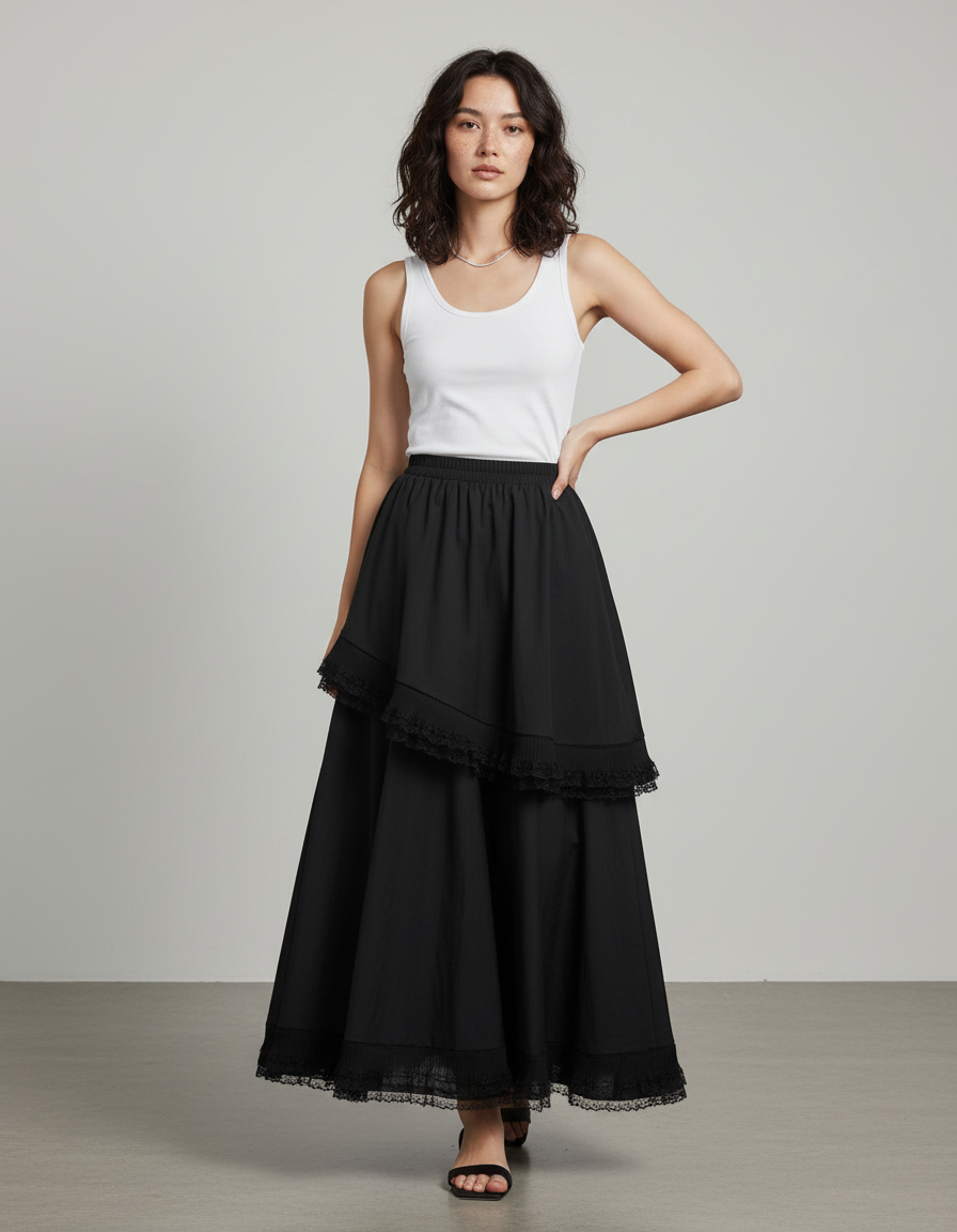 Jupe Longue Noire Volants Dentelle Bohème : Conception à Volants et Dentelle