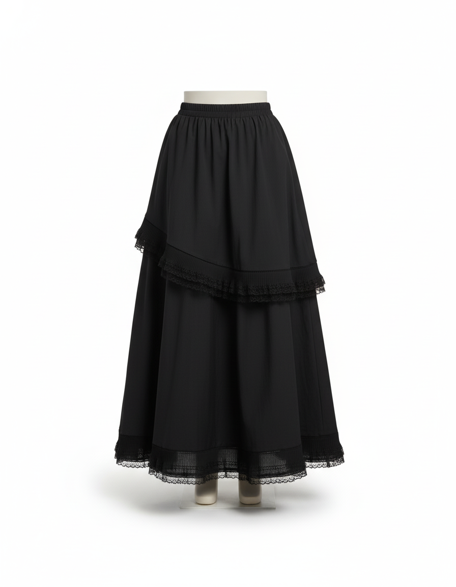 Cette jupe présente une coupe longue et une couleur noire unie. Elle est composée de plusieurs niveaux agrémentés de dentelle sur les bords.