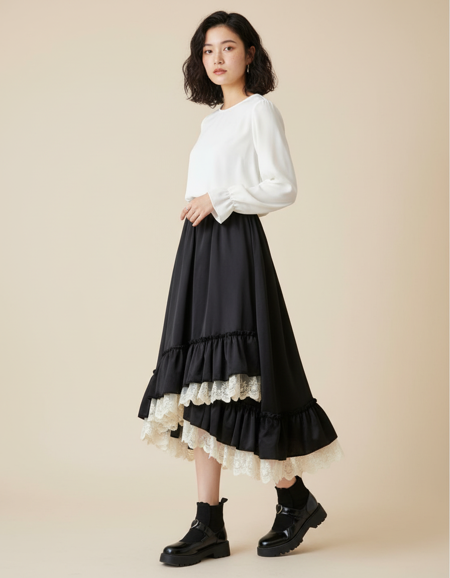 Jupe Longue Noire Volants Dentelle Élégante : L'Audace Raffinée