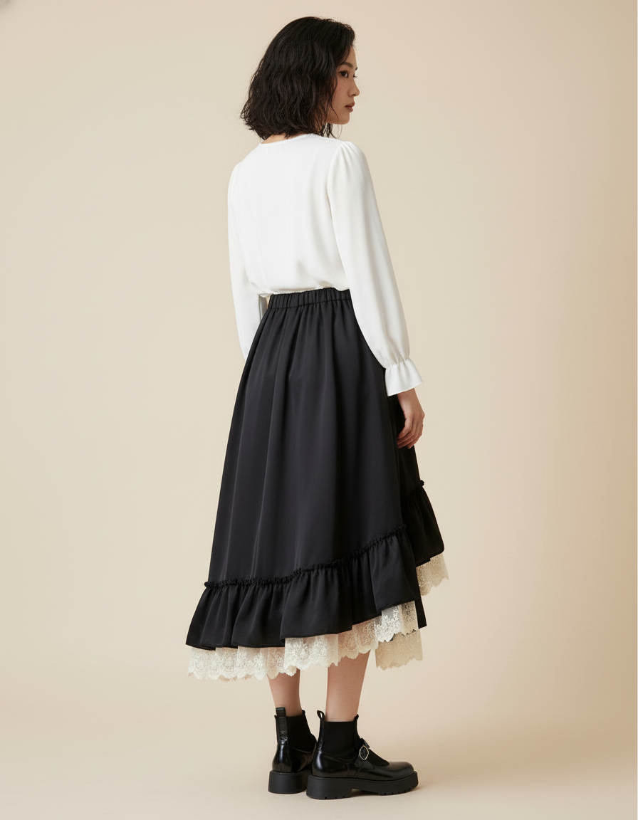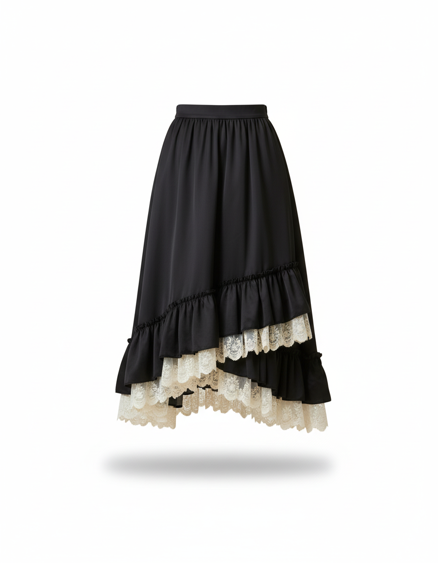 Jupe Longue Noire Volants Dentelle Élégante à Ourlet Irrégulier