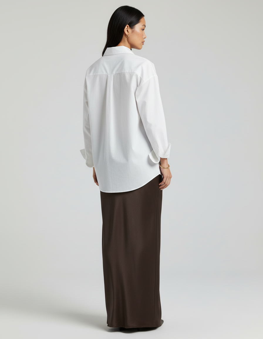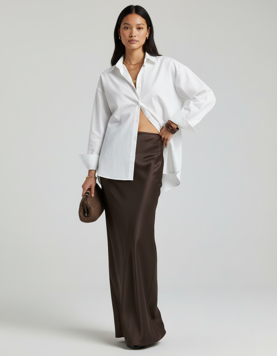La Jupe Longue Opaque en satin marron est une pièce maîtresse qui transcende les occasions. Pour une allure sophistiquée en journée, associez-la à une chemise ample en lin blanc et des sandales plates pour un chic décontracté et raffiné. Le soir, transformez-la sans effort avec un top en soie ajusté, des talons et des bijoux délicats pour un dîner élégant, une réception ou une soirée mémorable. Son coloris intemporel et sa matière précieuse s'adaptent à toutes vos envies, des rendez-vous professionnels aux célébrations.