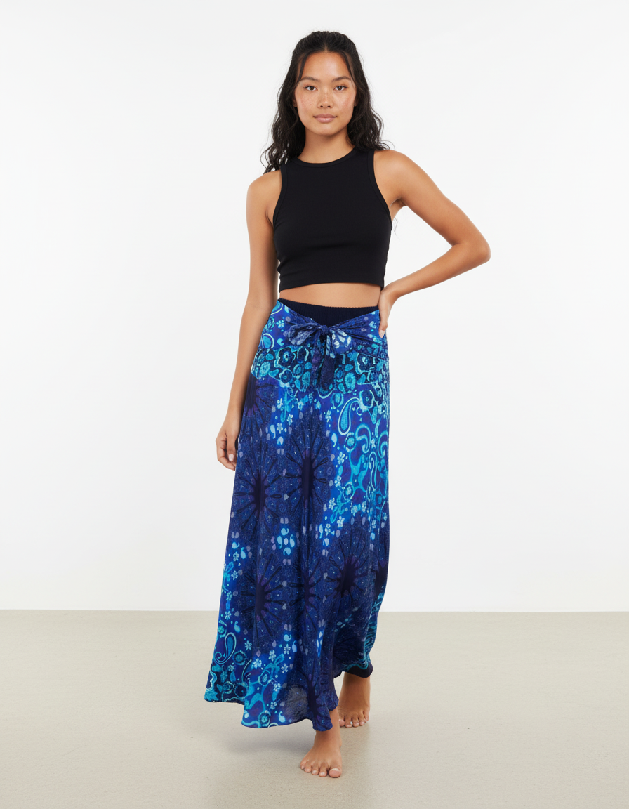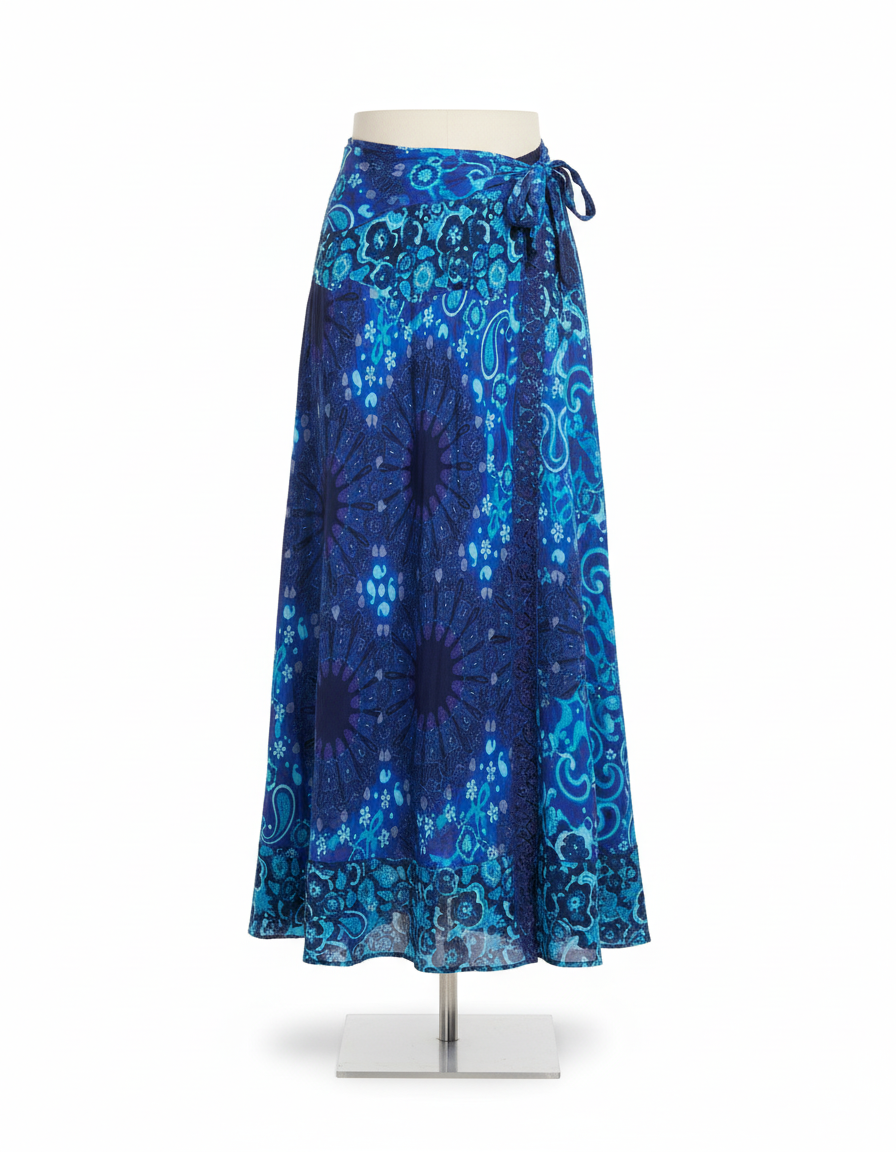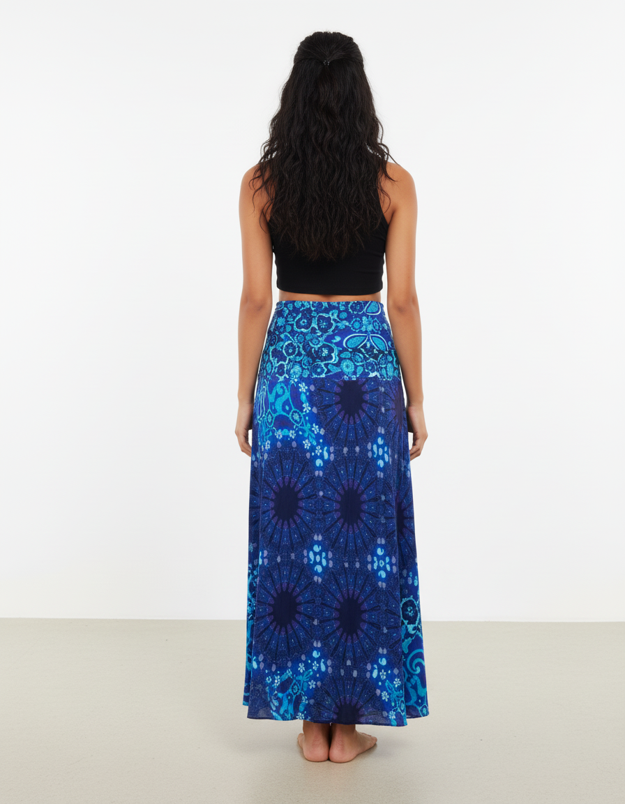 Cette jupe longue présente un design avec des motifs bleus variés. Elle est dotée d'une ceinture à nouer visible à la taille.