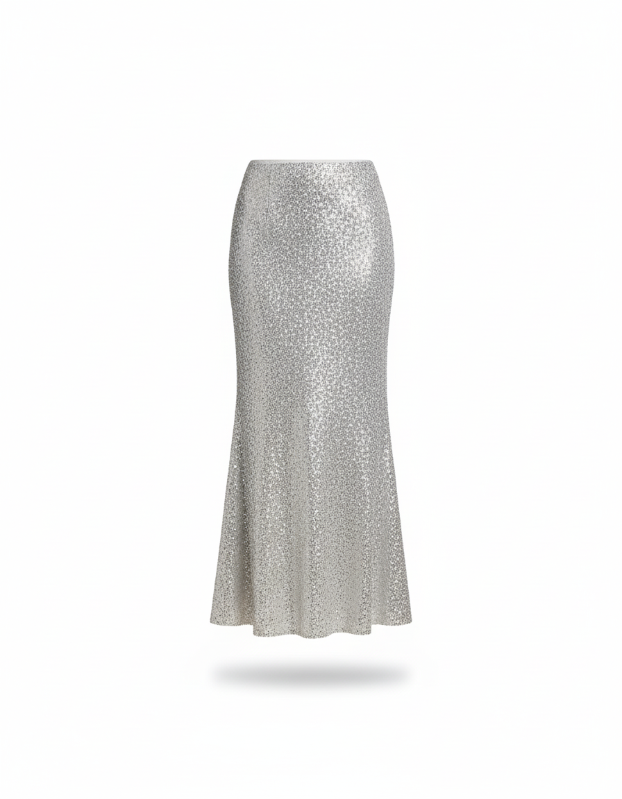 Cette jupe est un vêtement long de couleur argentée, entièrement recouverte de paillettes. Sa coupe est ajustée jusqu'aux hanches et s'élargit vers l'ourlet.