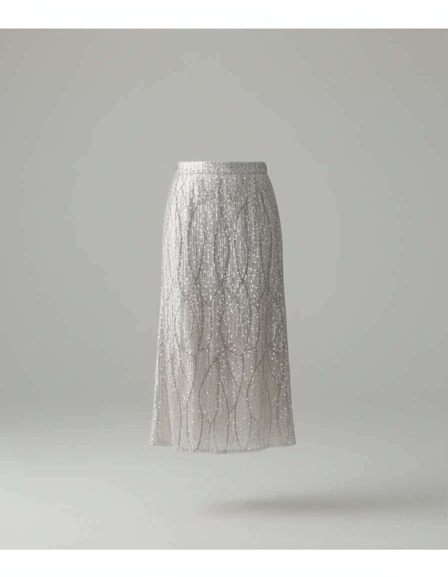 Cette jupe est un vêtement long de couleur argentée. Elle présente une surface entièrement recouverte de paillettes, s'étendant jusqu'à mi-mollet.
