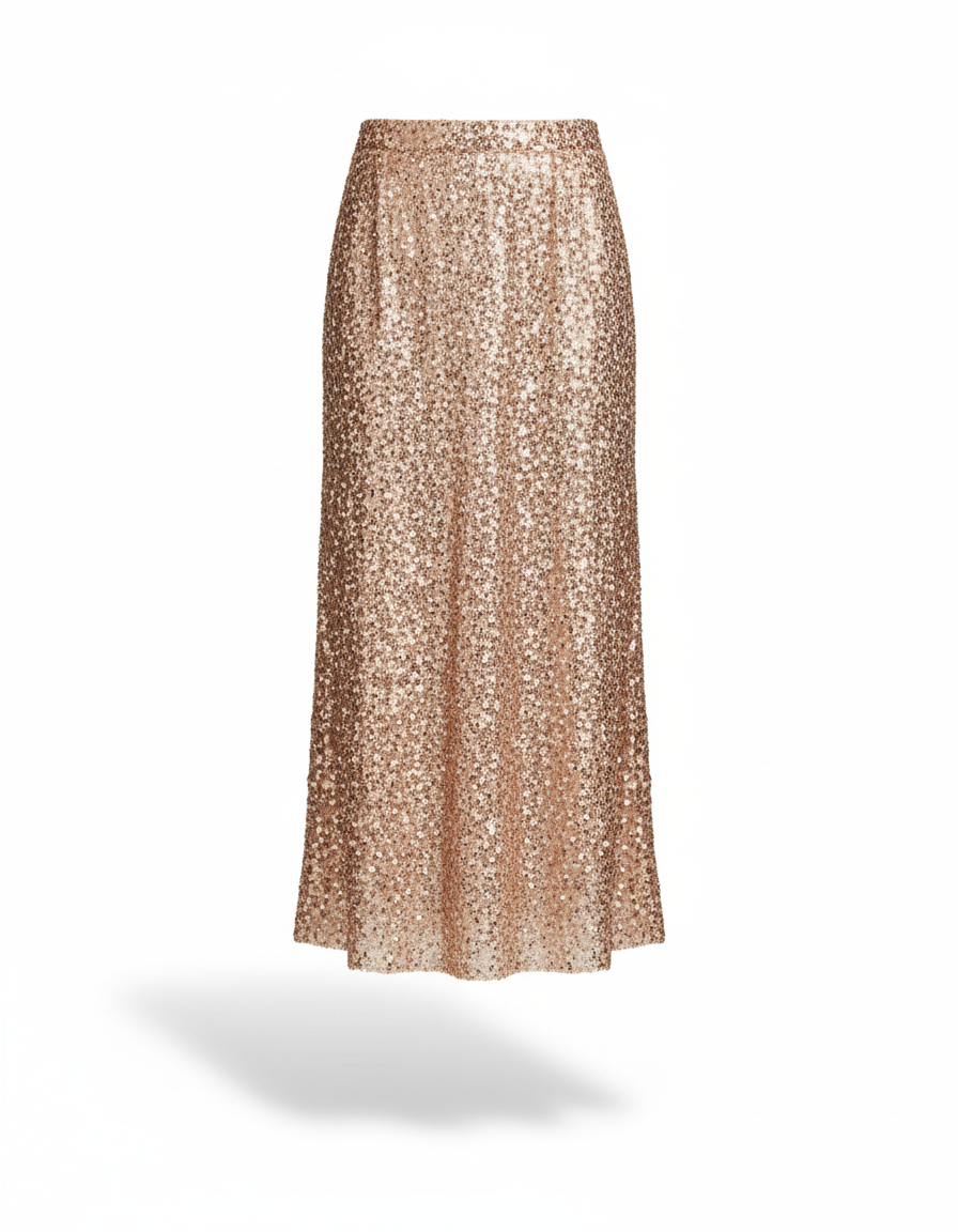 Cette jupe longue présente une surface entièrement recouverte de paillettes. Sa teinte est un rose doré, et la coupe atteint une longueur midi.