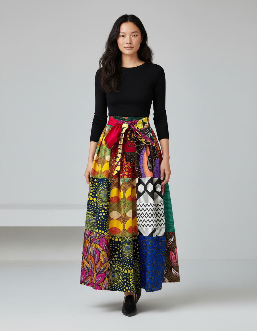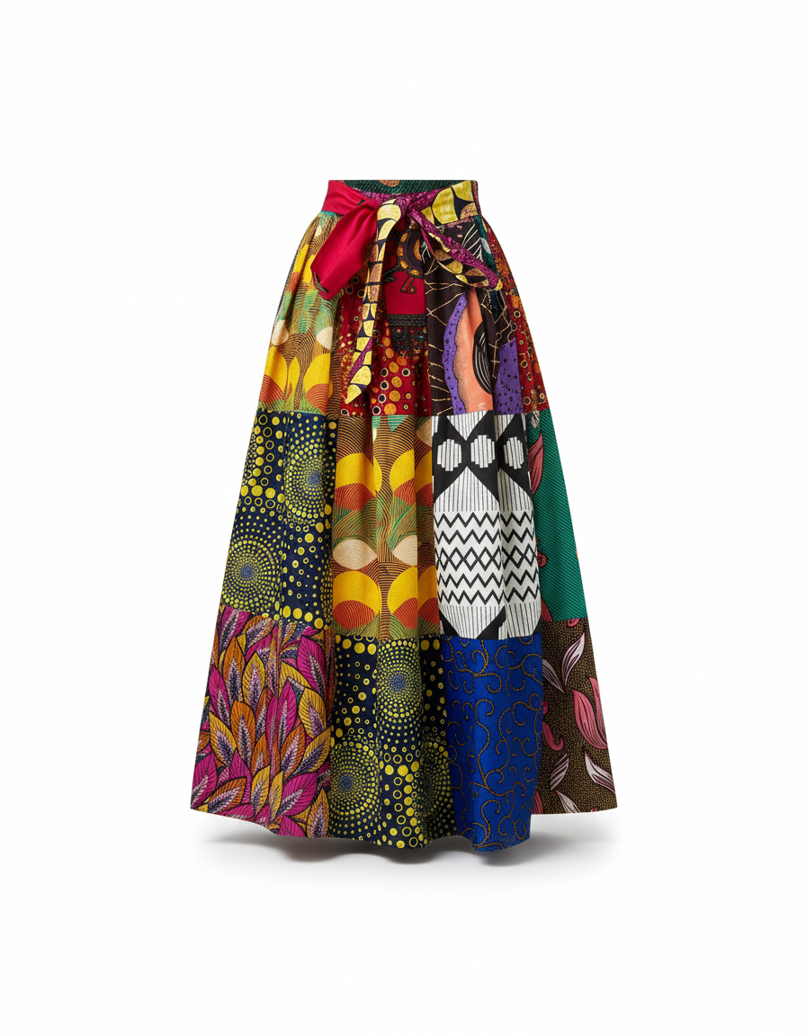 Découvrez l'éclat et l'originalité de notre jupe longue patchwork, une pièce unique pour un style affirmé.
