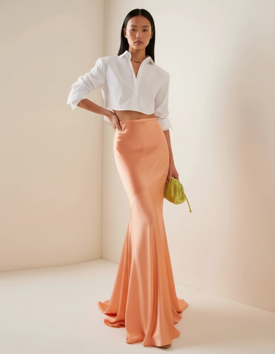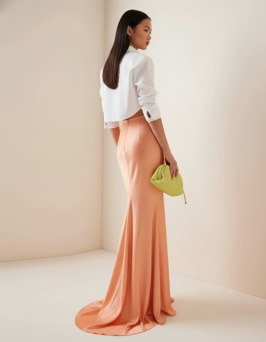 Jupe Pêche : Silhouette Majestueuse, Élégance Pure.