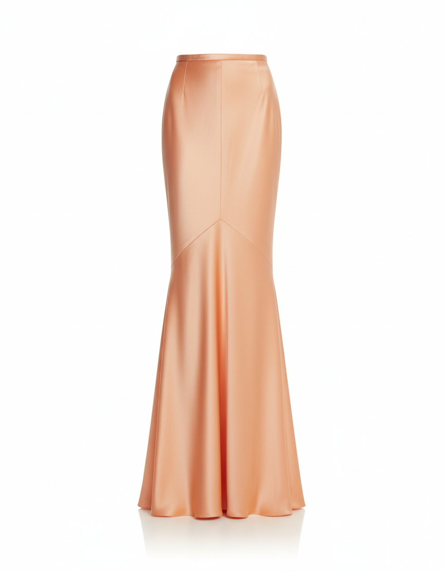 Cette jupe longue présente une coupe sirène avec une couleur pêche. Elle est conçue avec une taille zippée et une longueur personnalisable.