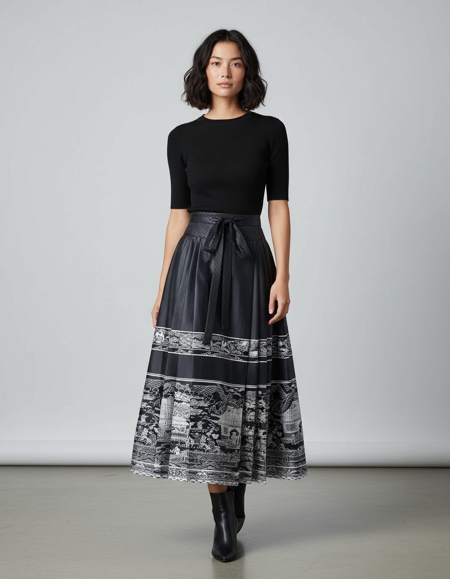 Ce qui distingue véritablement la Jupe Longue Plis Plats, c'est son motif monochrome saisissant, une fresque détaillée qui transforme chaque mouvement en une déclaration visuelle. Les plis plats structurés à la taille s'ouvrent sur un volume gracieux, tandis que la ceinture assortie, nouée avec élégance, sculpte subtilement la silhouette. Loin des créations éphémères, cette jupe est une œuvre d'art portable, un investissement dans un style intemporel et distinctif qui vous démarquera avec une touche de luxe discret et audacieux.