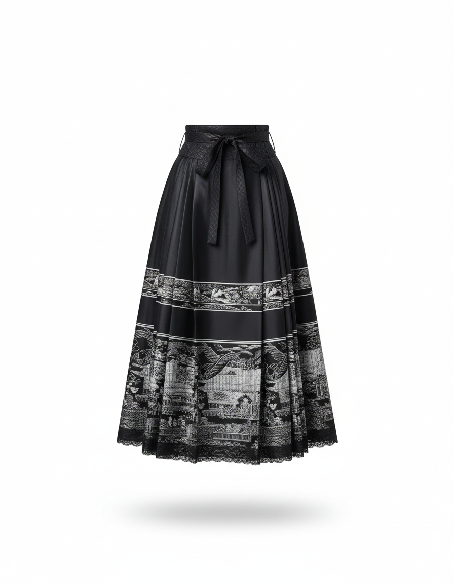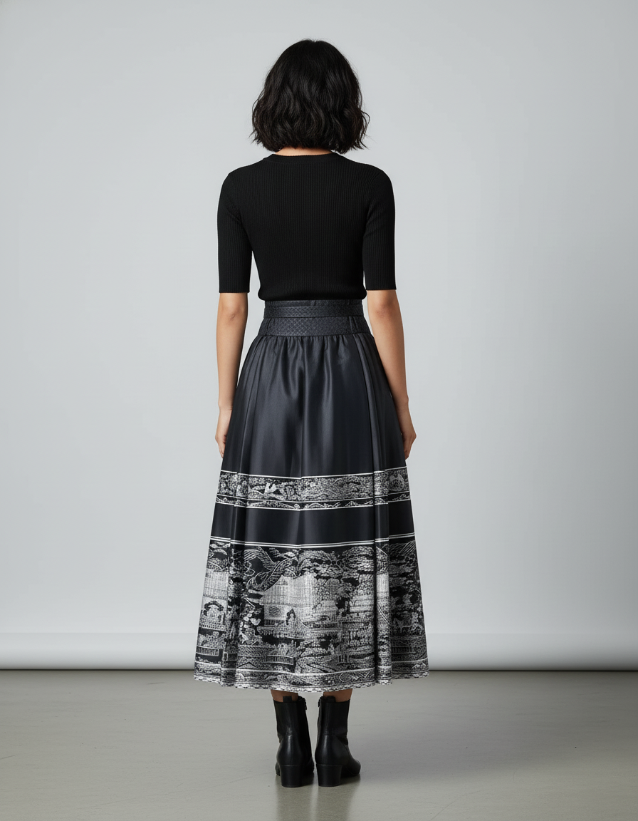 - Couleur : Noire, avec un motif imprimé en nuances de blanc et gris sur le bas de la jupe.
