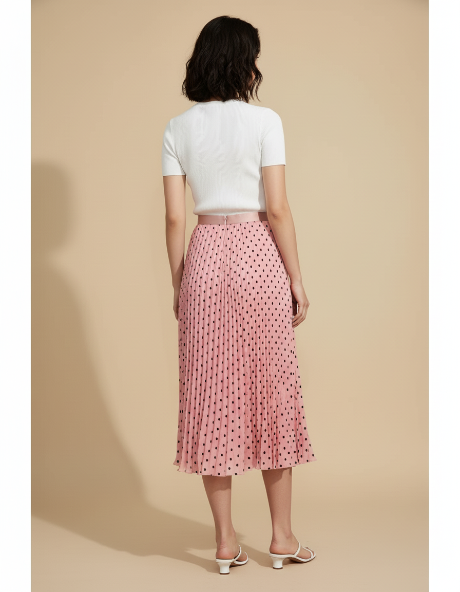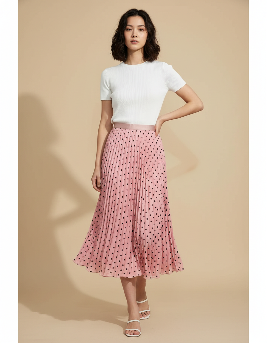 Adoptez un look chic et féminin avec notre jupe longue plissée à pois, parfaite pour toutes les occasions.