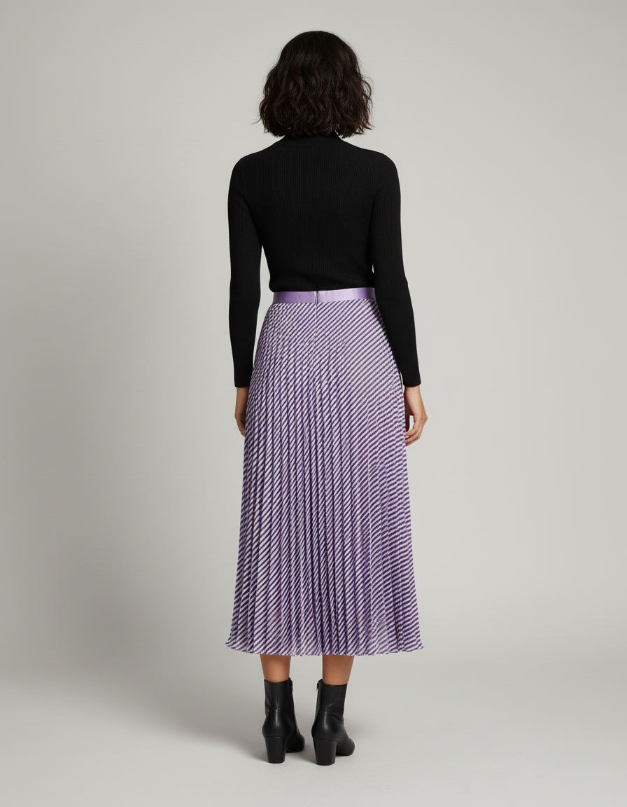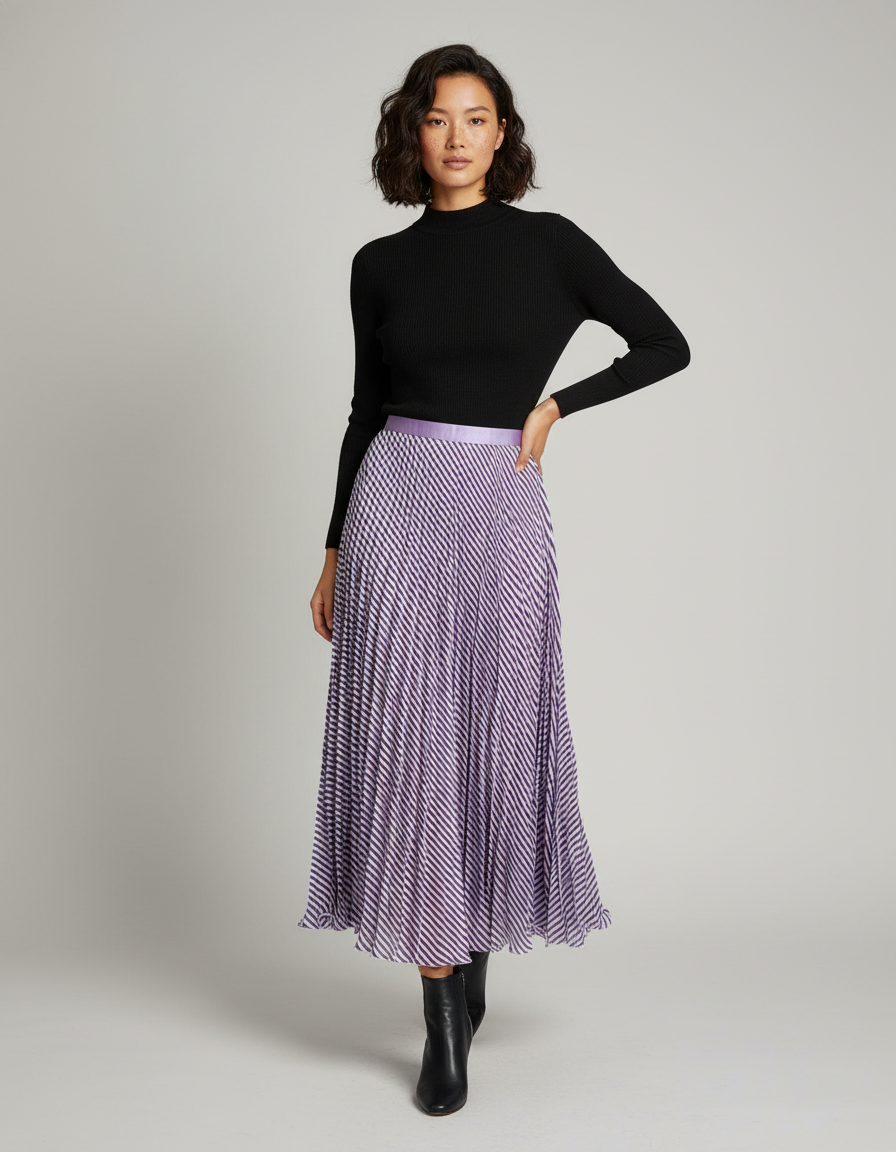 Confectionnée dans une mousseline délicate, notre Jupe Longue Plissée Bicolore offre une légèreté incomparable. Son plissé soleil, d'une précision remarquable, crée un volume aérien et un tombé impeccable qui sublime la silhouette. La taille haute, avec sa bande satinée (violette sur l'image), assure un maintien confortable sans jamais restreindre, vous offrant une liberté de mouvement absolue. Les fines rayures diagonales, mélange subtil de violet et de blanc, animent chaque mouvement et captent la lumière avec une élégance discrète, garantissant une allure fluide et gracieuse en toutes circonstances.