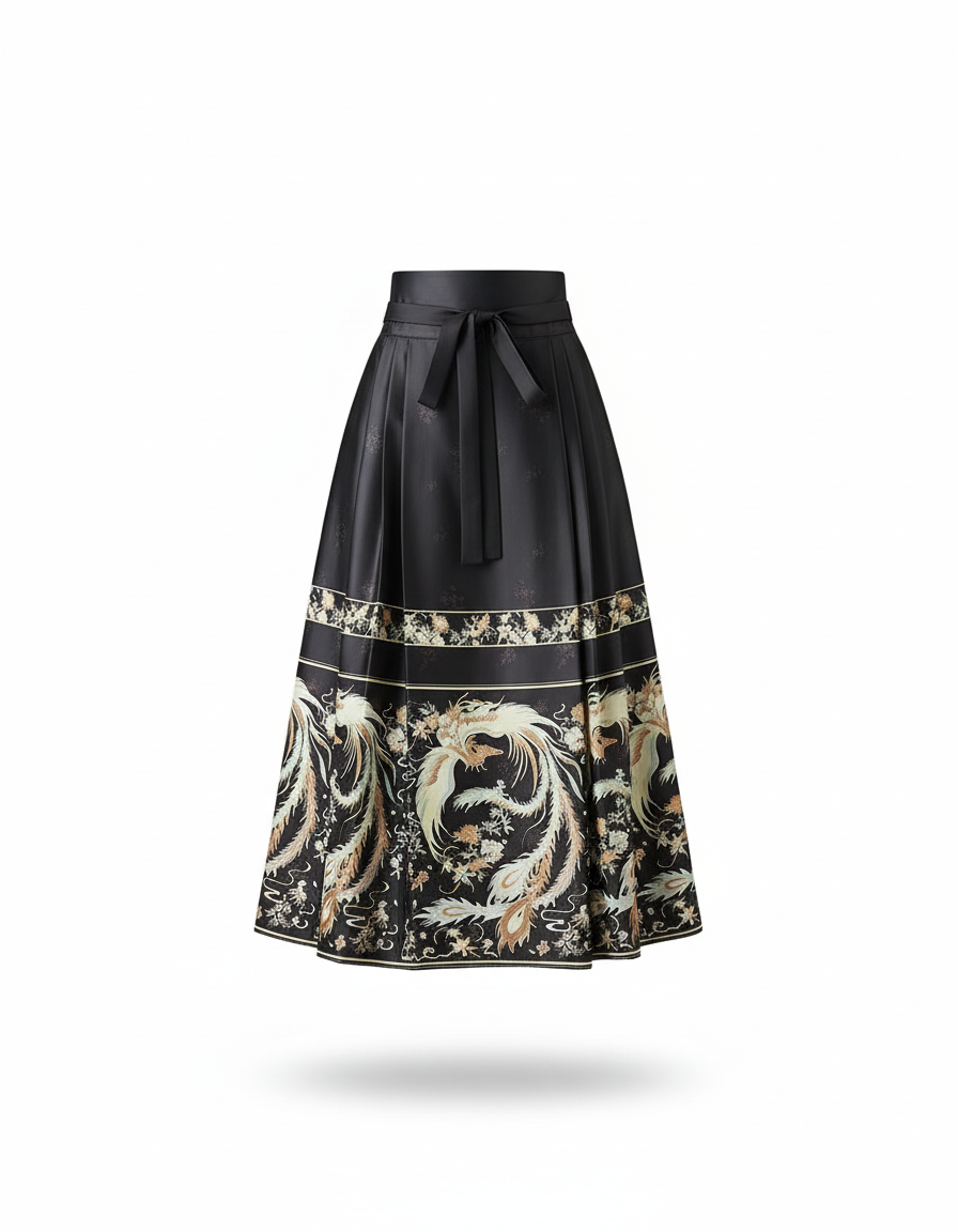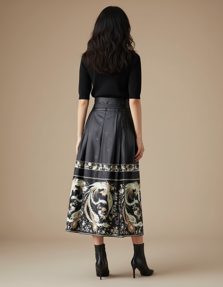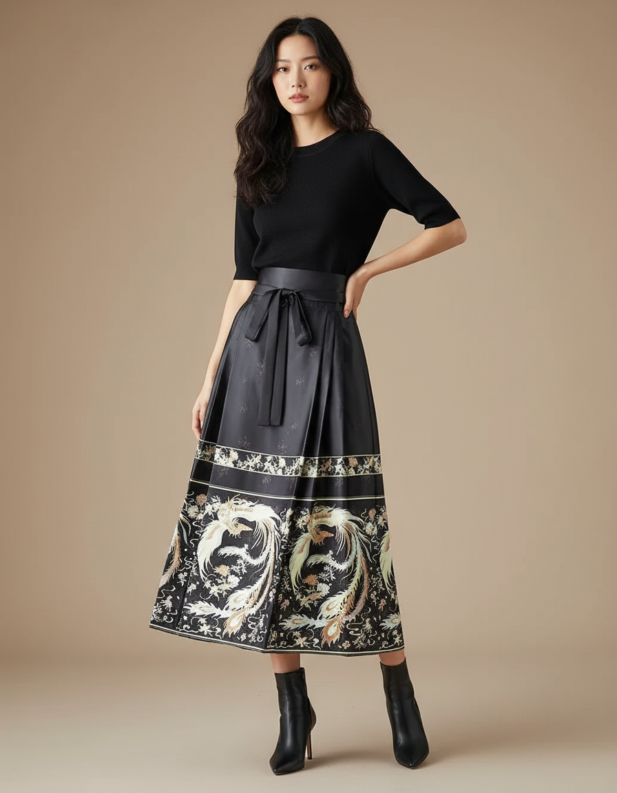 An East Asian woman stands elegantly in a full-body shot, centered against a plain, light beige background. She has long, dark, wavy hair styled over her shoulders and a neutral expression, looking directly at the camera. She is wearing a stylish outfit consisting of a black, short-sleeved, ribbed knit top with a round neckline. Her waist is cinched by a wide black belt, tied into a neat bow at the front. Below the belt, she wears a black midi-length pleated skirt. The skirt is the focal point of the outfit, featuring a wide, elaborate border at the hem. This border showcases intricate designs of two large, stylized mythical birds, possibly phoenixes, with flowing tail feathers in shades of white, cream, light green, and soft brown, set against the black fabric. These birds are surrounded by delicate floral and scrollwork motifs. Above this main border, there's a narrower decorative band with a lighter pattern. The upper part of the skirt, above the belt, also appears to have a subtle, possibly embossed or embroidered pattern. She completes her look with black ankle boots that have pointed toes and heels. The heel of her left boot has a distinct red or metallic accent. Her left hand rests on her hip, while her right arm is slightly bent at her side. The lighting is soft and even, highlighting the details of her attire and her features.