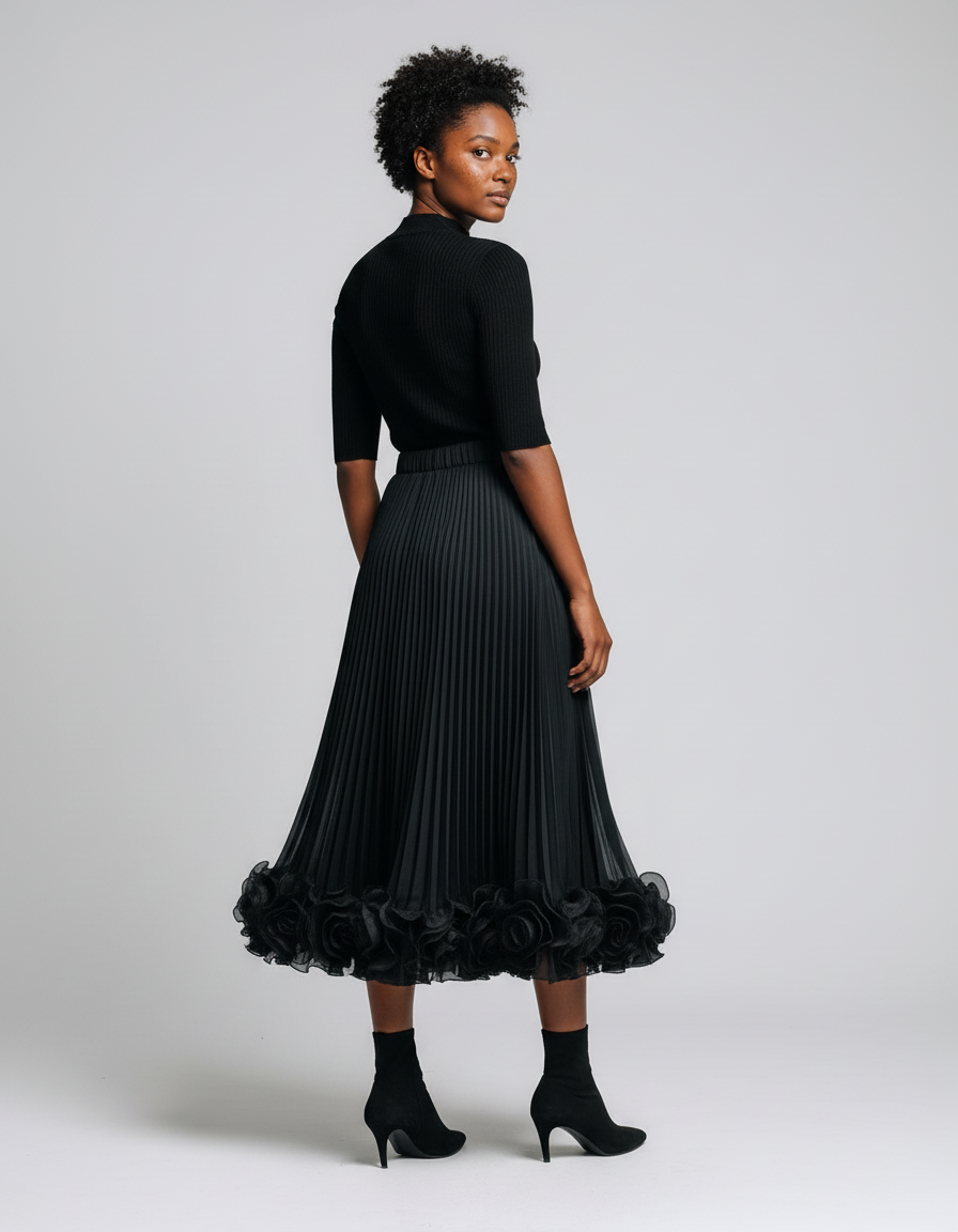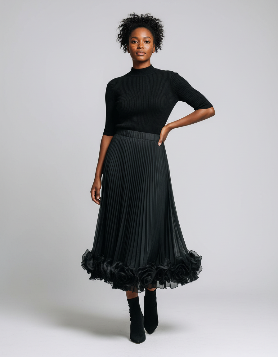 Découvrez la Jupe Longue Plissée Fleurs 3D Élégante, une pièce maîtresse qui allie sophistication et fantaisie. Sa mousseline noire fluide, délicatement plissée, est sublimée par une bordure ornée de fleurs en 3D, créant un mouvement captivant à chaque pas. Pour un look de jour chic et raffiné, associez-la à un pull col roulé ajusté et des bottines élégantes, comme sur l'image, ou des ballerines pour une touche plus légère. En soirée, transformez-la avec un top en soie, des talons aiguilles et des bijoux discrets pour une allure glamour et inoubliable. Cette jupe est conçue pour s'adapter à toutes vos envies, des rendez-vous professionnels aux événements les plus spéciaux, en passant par un brunch dominical stylé.