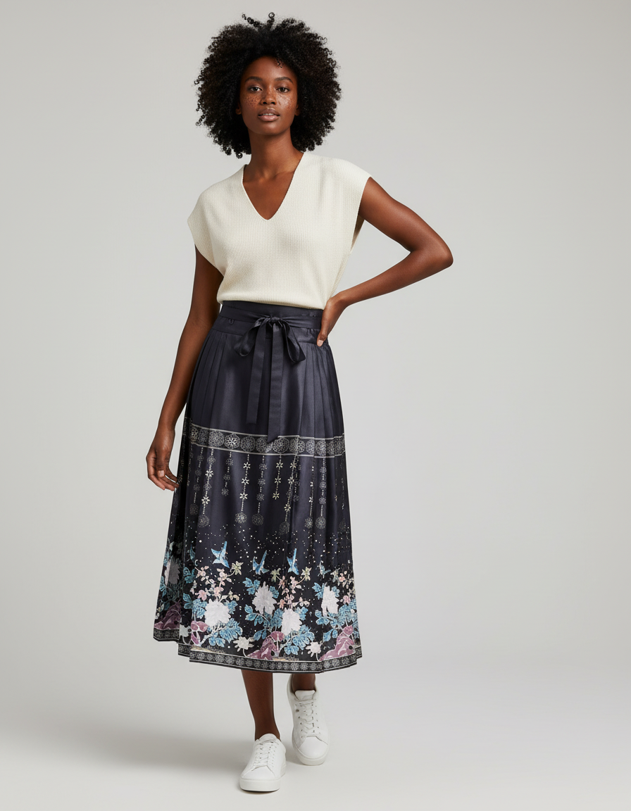 Sublimez votre style avec notre Jupe Longue Plissée Florale, une pièce maîtresse conçue pour s'adapter à chaque moment de votre vie. Pour une allure décontractée chic, associez-la à un pull en maille fine et des baskets immaculées, comme le modèle présenté, idéale pour une sortie en ville ou un brunch. Transformez-la pour une soirée élégante en l'associant à un caraco en soie et des talons raffinés, ou pour un événement professionnel avec un chemisier ajusté et un blazer structuré. Sa palette florale délicate sur fond sombre offre une toile de fond parfaite pour des accessoires variés, vous permettant de créer des ensembles uniques et sophistiqués.