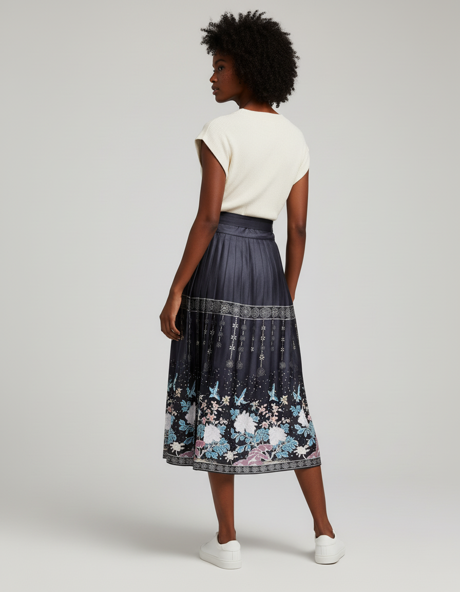 Apportez une touche de poésie à votre garde-robe avec cette jupe plissée ornée de motifs floraux délicats.