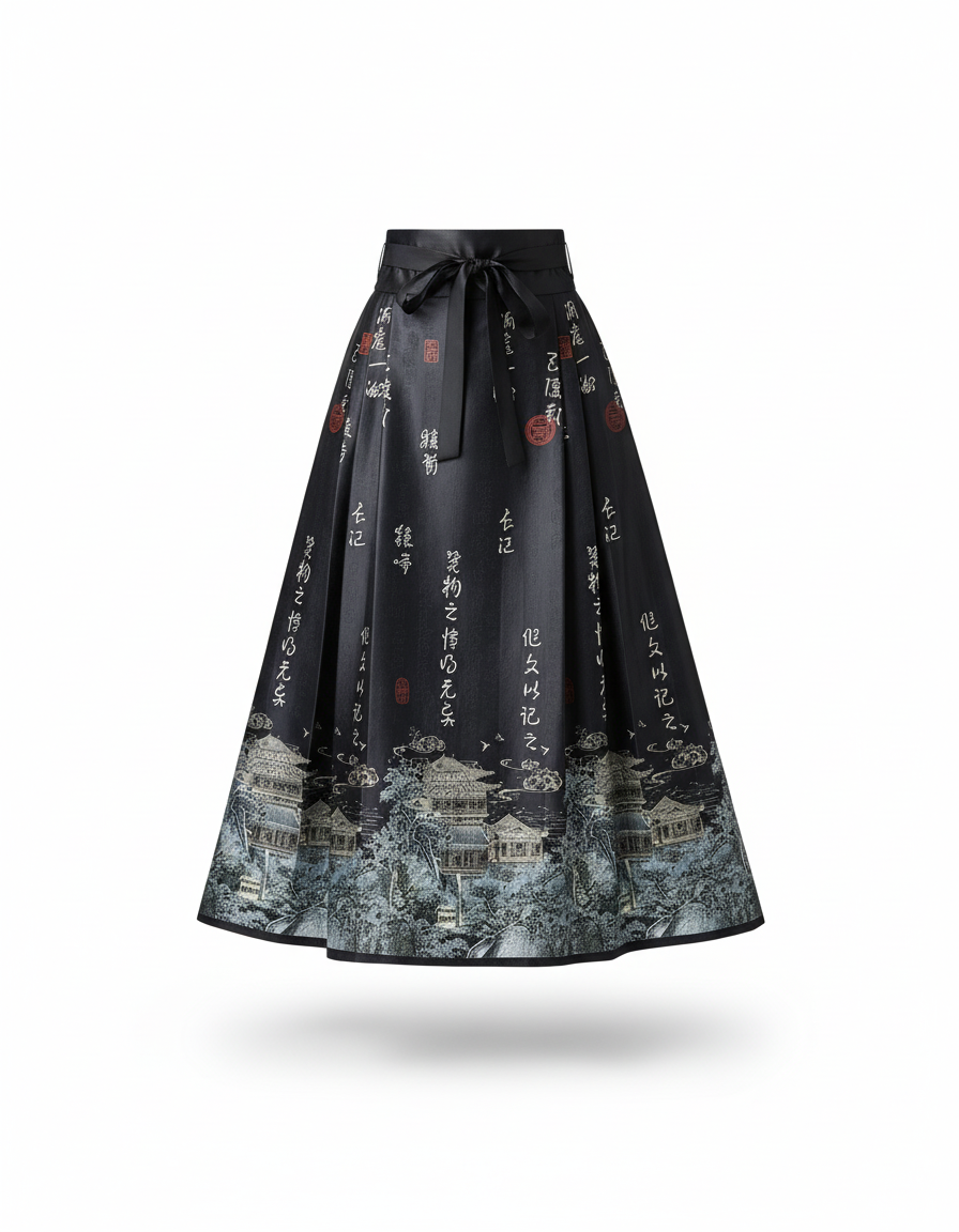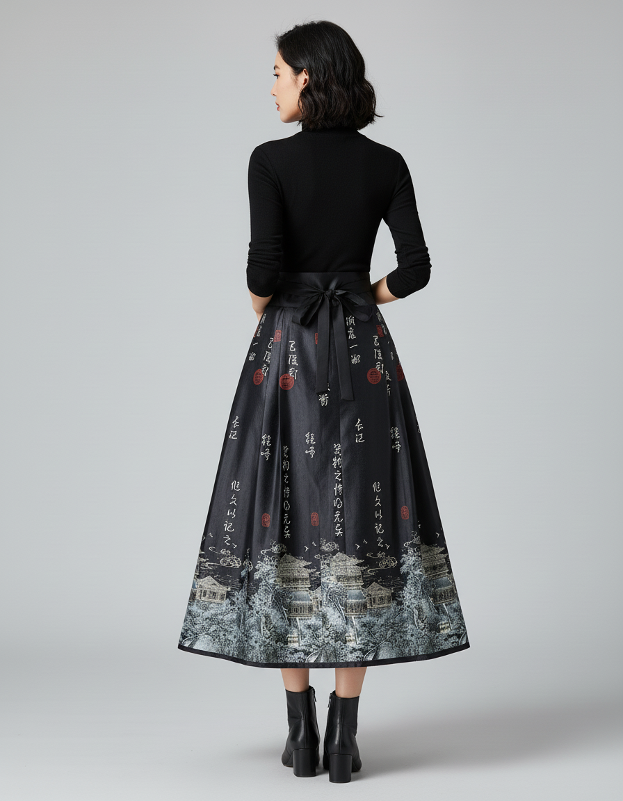 Découvrez l'élégance intemporelle avec notre Jupe Longue Plissée, ornée d'un magnifique imprimé inspiré de l'art chinois traditionnel.