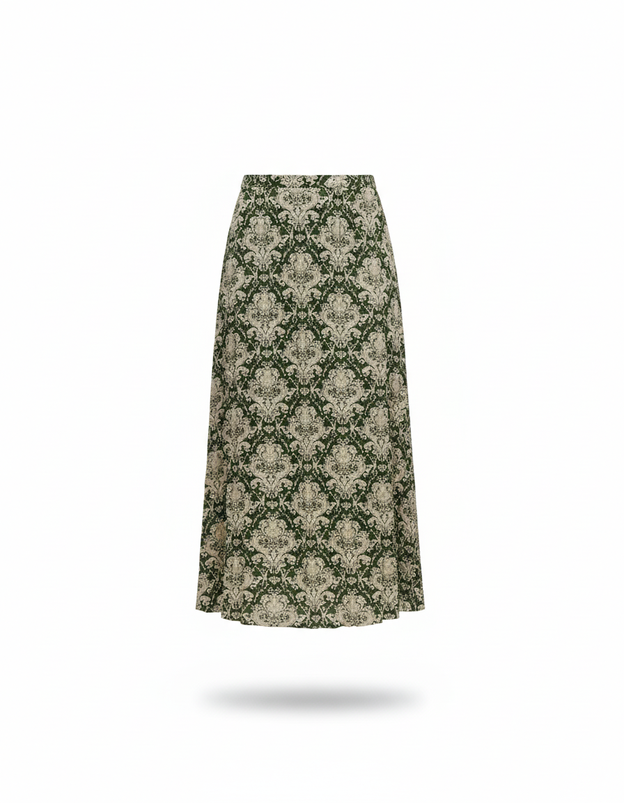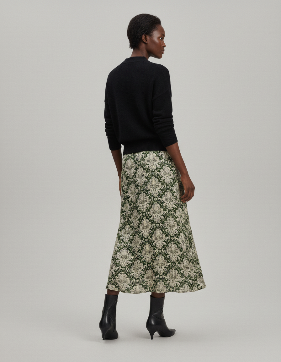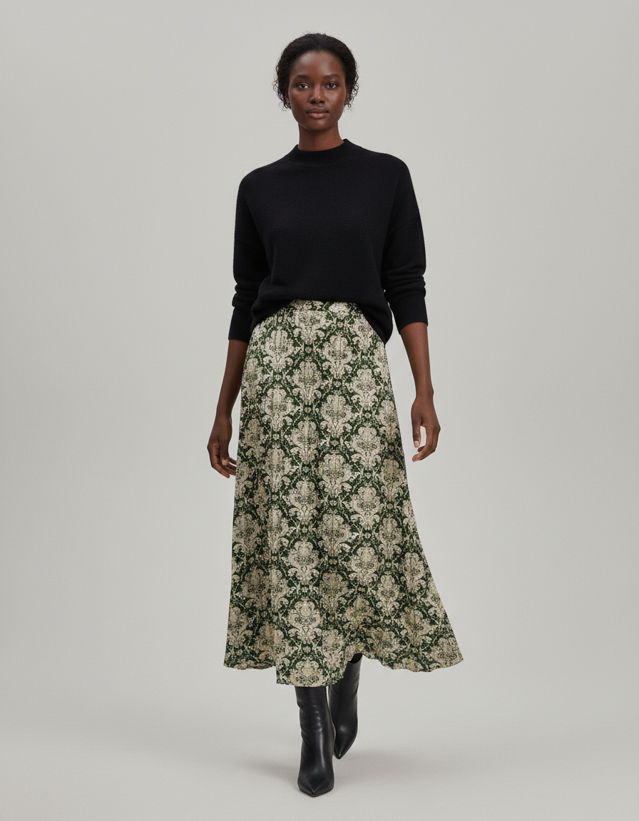 Ce qui distingue cette jupe, c'est son équilibre parfait entre un motif intemporel et une coupe contemporaine. Loin des plissés rigides, sa matière fluide assure un drapé sublime et un tombé impeccable, qui flatte toutes les morphologies. Son imprimé exclusif apporte une touche d'originalité et de raffinement qui vous fera remarquer avec subtilité. Associez-la à un pull en maille fine pour un look de jour chic, ou à un chemisier en soie pour une sophistication du soir. Une pièce versatile, conçue pour celles qui osent exprimer leur singularité avec grâce et distinction.