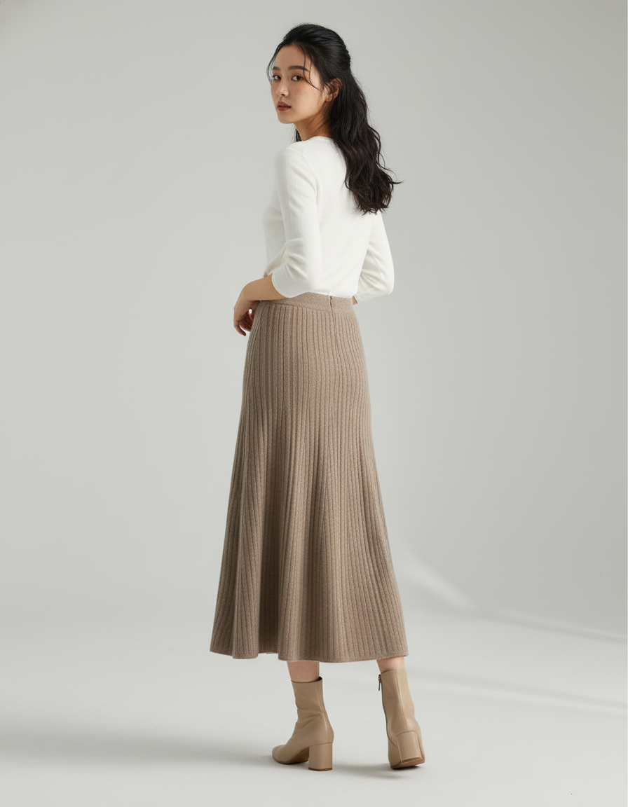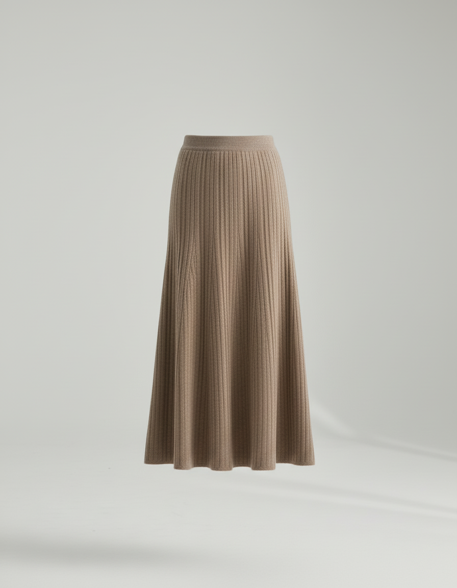 Cette jupe longue est confectionnée en 100% laine Mérinos extrafine d'Australie. Elle présente une couleur marron et un tricot côtelé avec des lignes verticales.