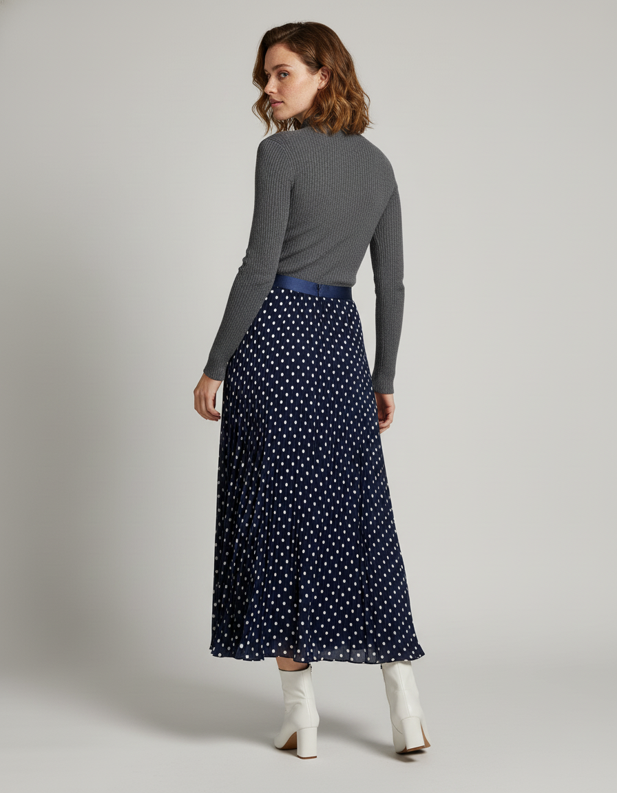 Notre jupe longue plissée en mousseline bleu marine, ornée de son motif délicat, offre une fluidité exceptionnelle. Sa matière légère et agréable sur la peau garantit un confort absolu tout au long de la journée. Chaque pas est une invitation à la grâce, grâce à son plissé parfait qui accompagne vos mouvements sans contrainte. Son tombé impeccable sublime la silhouette avec élégance, sans jamais l'alourdir, et s'adapte merveilleusement aux superpositions hivernales.