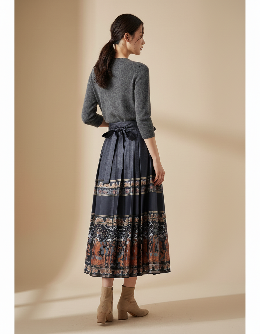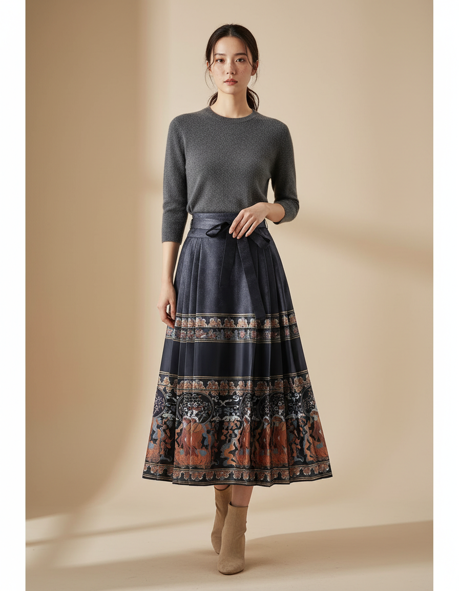 Ce qui distingue notre jupe, c'est l'harmonie parfaite entre son motif ethnique richement détaillé et sa coupe plissée intemporelle. Chaque pli est méticuleusement travaillé pour créer un mouvement fluide et gracieux, tandis que la taille haute sublime votre silhouette. Loin des créations éphémères, cette jupe est une œuvre d'art portable, un investissement dans un style qui ne se démode jamais. Elle se marie aisément avec un simple pull en cachemire pour une élégance discrète ou un chemisier soyeux pour un impact maximal, affirmant votre goût pour l'exceptionnel.