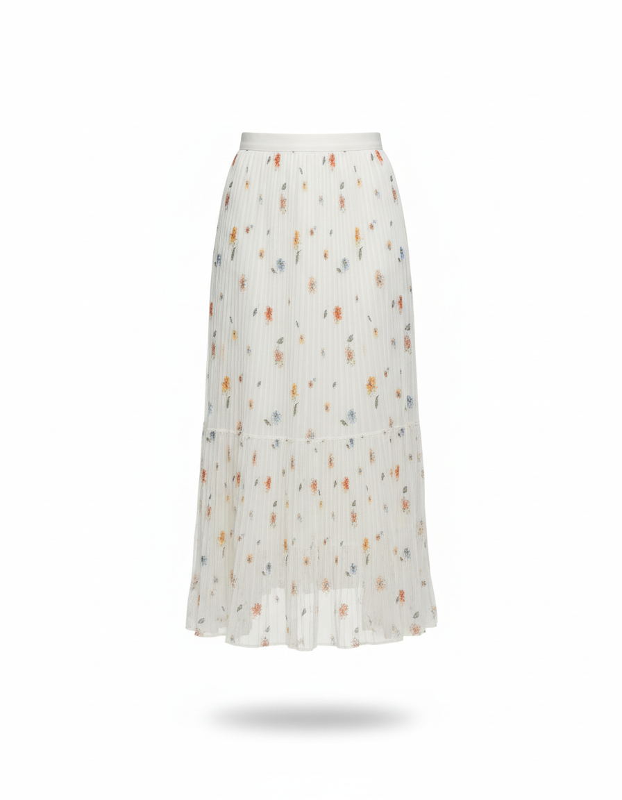 Cette jupe présente une coupe longue et plissée. Elle est ornée d'un motif floral multicolore sur un fond clair.