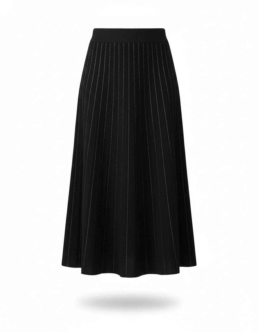 Cette jupe longue est confectionnée en laine Mérinos d'Australie. Elle présente une coupe plissée et un motif de fines lignes verticales à l'aspect brillant sur fond noir.