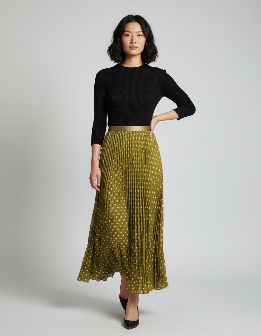 Cette jupe longue plissée à pois est la pièce parfaite pour un look chic et moderne.