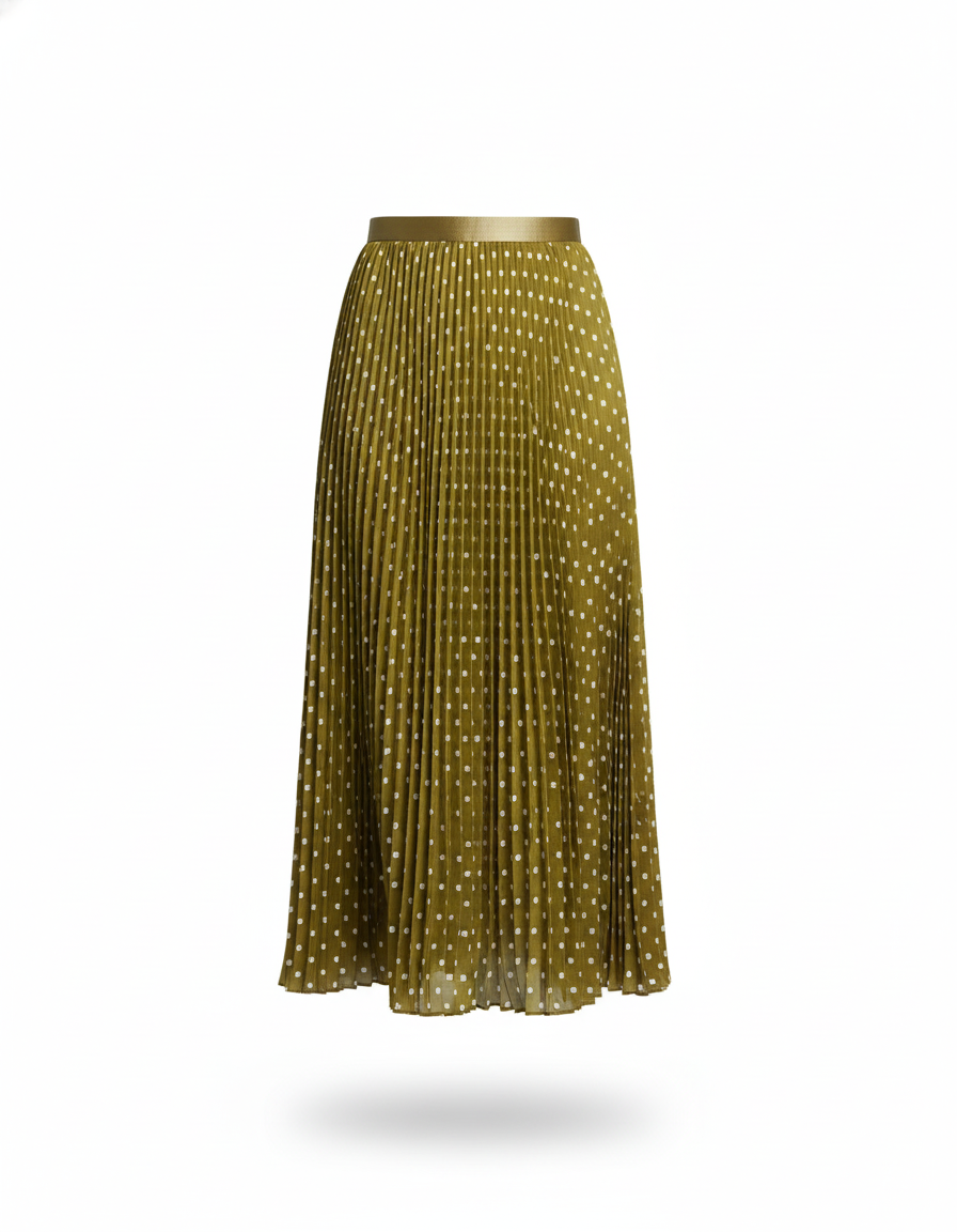 Ce qui distingue cette jupe, c'est son mariage audacieux de la couleur verte olive, profonde et contemporaine, avec des pois délicats qui ponctuent son plissé impeccable. Loin des motifs classiques, cette interprétation moderne des pois apporte une touche de fantaisie raffinée. Chaque pli est conçu pour conserver sa forme, garantissant un tombé parfait et un mouvement gracieux. C'est plus qu'une jupe ; c'est une affirmation de style, une invitation à embrasser une élégance discrète mais mémorable, qui vous assure de vous démarquer avec goût.