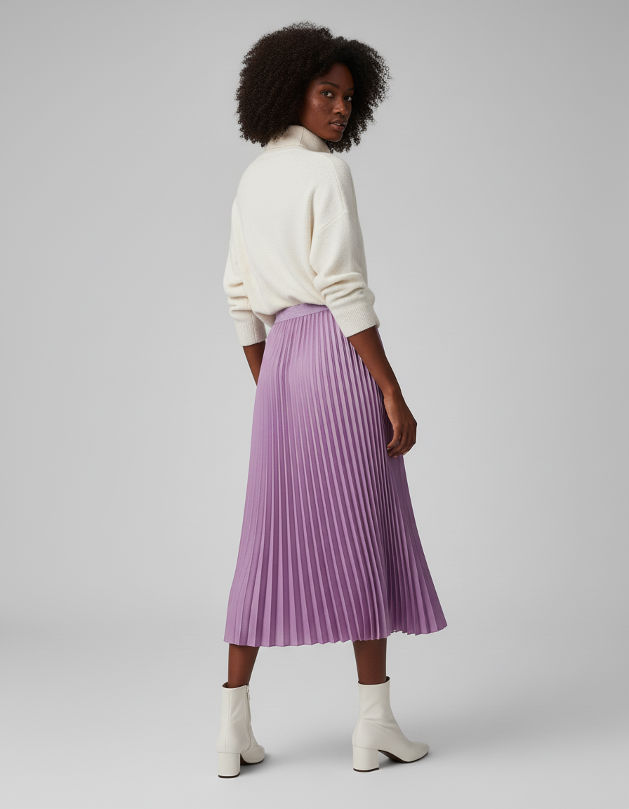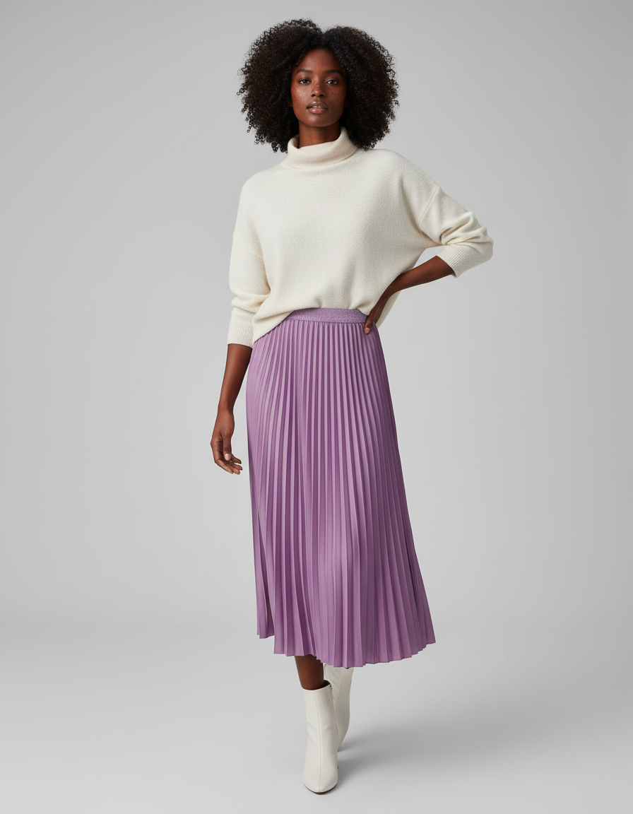 Polyvalente et raffinée, cette jupe violette se prête à de multiples interprétations. Pour une allure de gala, associez-la à un top en soie ajusté et des talons aiguilles. Pour une élégance plus décontractée mais toujours chic, comme sur notre modèle, mariez-la à un pull en maille fine couleur crème et des bottines claires. Elle est l'alliée parfaite pour illuminer vos événements, des dîners élégants aux réceptions mondaines, en passant par une sortie sophistiquée. Exprimez votre style avec assurance et distinction.