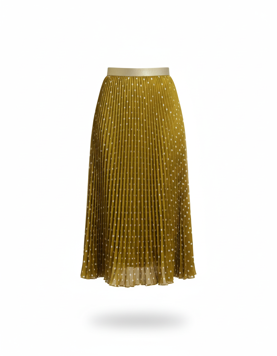Idéale pour la femme contemporaine qui ne transige pas sur le style ni le confort, cette jupe se distingue par son imprimé délicat et sa palette de couleurs raffinée (vert olive et pois blancs). Elle se marie parfaitement avec un pull en maille fine pour un look de jour décontracté-chic, ou avec un chemisier en soie pour une occasion spéciale. Plus qu'un simple vêtement, elle est une invitation à exprimer votre individualité avec audace et finesse, se démarquant des classiques par son originalité discrète et sa qualité supérieure qui assure une durabilité et un tombé parfait.