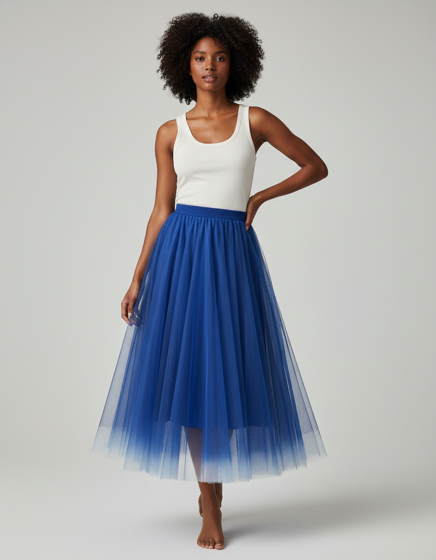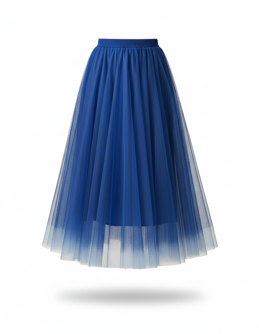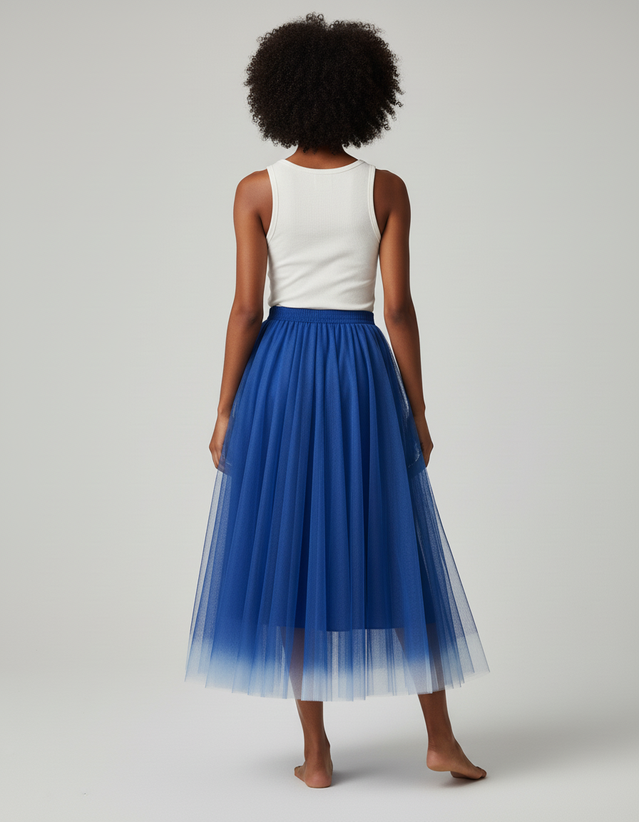 Découvrez la Jupe Longue Plissée Tie & Dye, une pièce maîtresse qui insuffle légèreté et caractère à votre garde-robe. Conçue en tulle aérien, sa silhouette fluide et ses plis délicats créent un mouvement captivant à chaque pas. Le dégradé tie-dye unique, d'un bleu profond à une nuance éthérée en son ourlet, offre une esthétique moderne et poétique. Ce n'est pas juste une jupe, c'est une expression artistique qui garantit une allure sophistiquée et un confort absolu, vous permettant de briller sans effort.