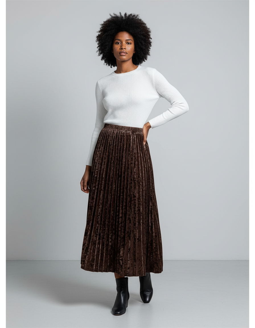 La Jupe Longue Plissée Velours est une pièce maîtresse pour composer des looks variés cet hiver. Pour un style casual chic au quotidien, associez-la à un pull en maille fine ou un top côtelé blanc impeccable et des bottines. En soirée, transformez-la avec un chemisier en soie fluide, des escarpins et quelques bijoux discrets pour une allure sophistiquée et intemporelle. Sa couleur marron profond se prête à merveille aux superpositions et aux camaïeux de saison, offrant une polyvalence inégalée.