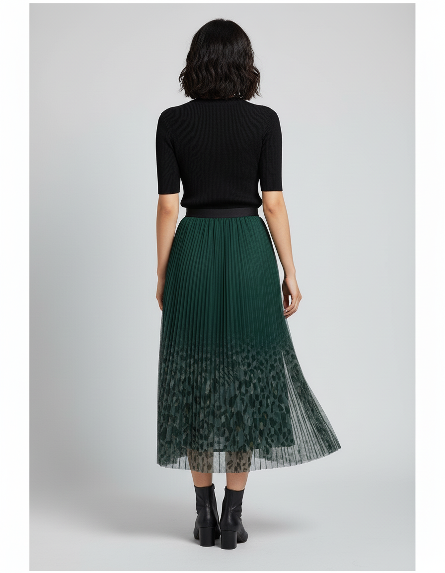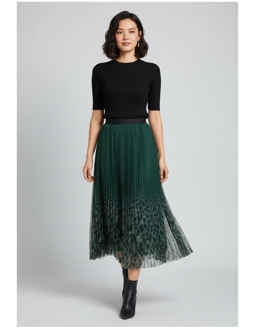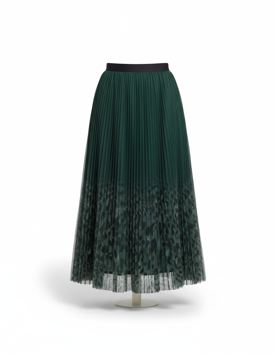 Jupe Longue Plissée Vert Sapin avec Imprimé Animalier