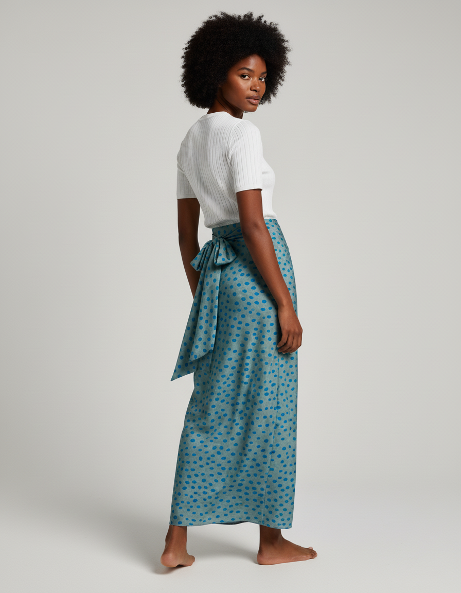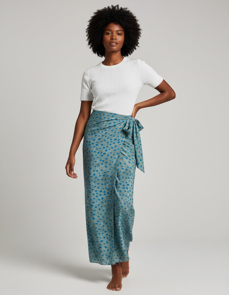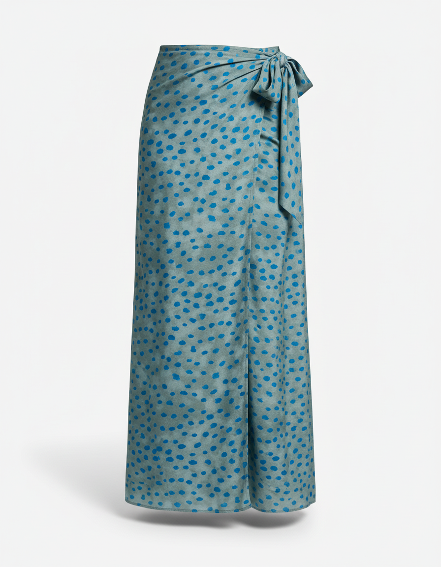Cette Jupe Longue Portefeuille Fendue présente une coupe portefeuille avec un nœud sur le côté. Sa longueur s'étend jusqu'aux chevilles, et elle est ornée d'un motif à pois.