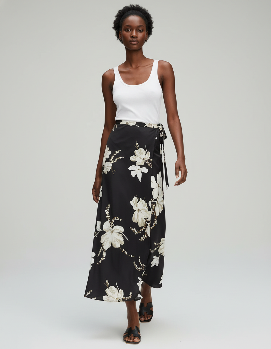 Cette jupe longue portefeuille fleurie est un incontournable pour un look estival élégant et confortable.