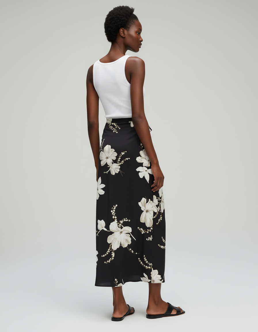 Découvrez notre Jupe Longue Portefeuille Fleurie Fluide, une pièce maîtresse conçue pour la femme qui cultive l'élégance avec une aisance naturelle. Confectionnée dans un satin d'une fluidité exceptionnelle, cette jupe enveloppe la silhouette avec une grâce inégalée. Son imprimé floral délicat, sur un fond noir profond, offre un contraste saisissant et une touche de sophistication discrète. La coupe portefeuille assure un ajustement parfait et une liberté de mouvement optimale, tandis que son tombé impeccable témoigne d'une qualité haut de gamme. C'est l'incarnation du luxe moderne : une esthétique raffinée alliée à un confort absolu, vous permettant de vous sentir aussi belle que bien.