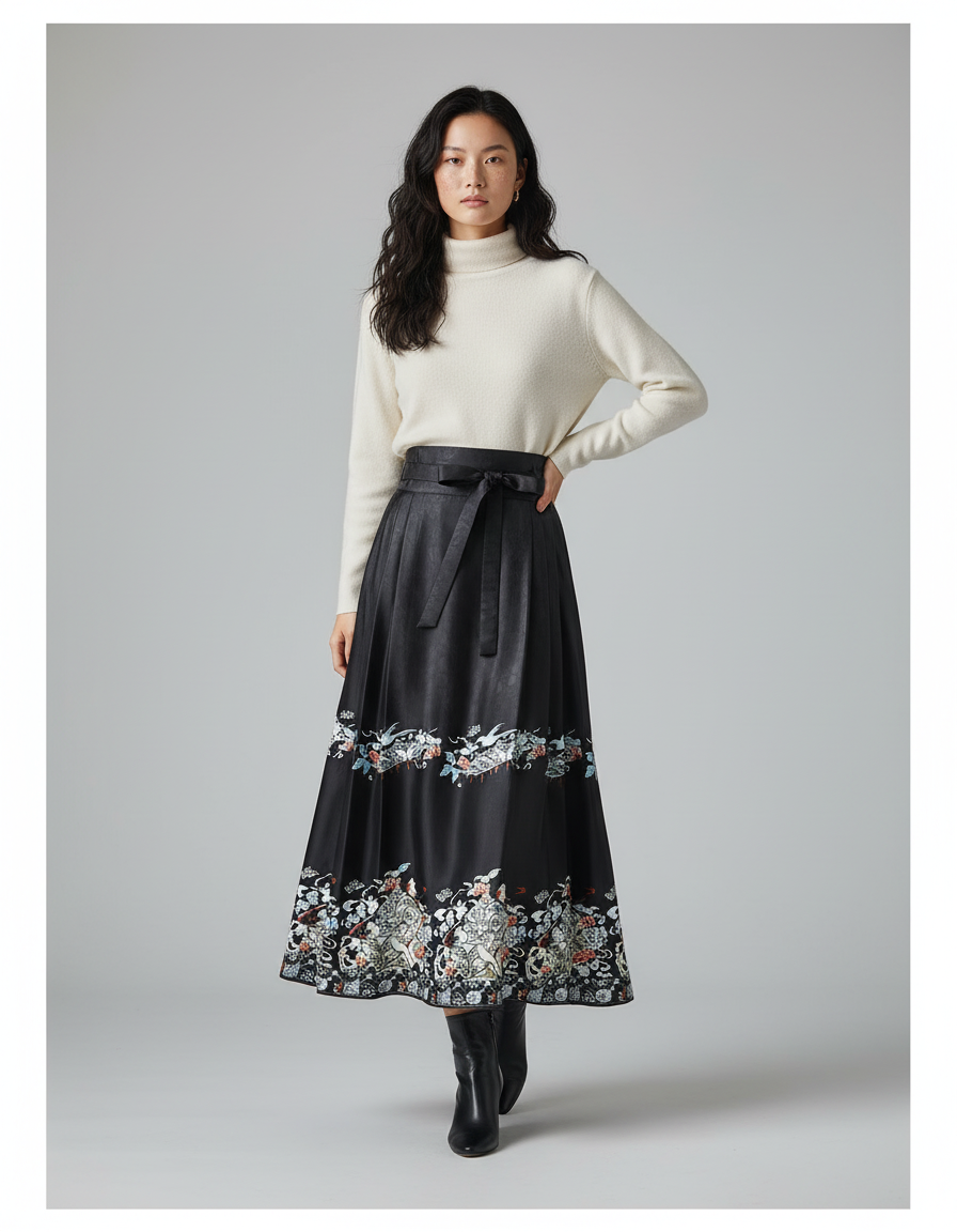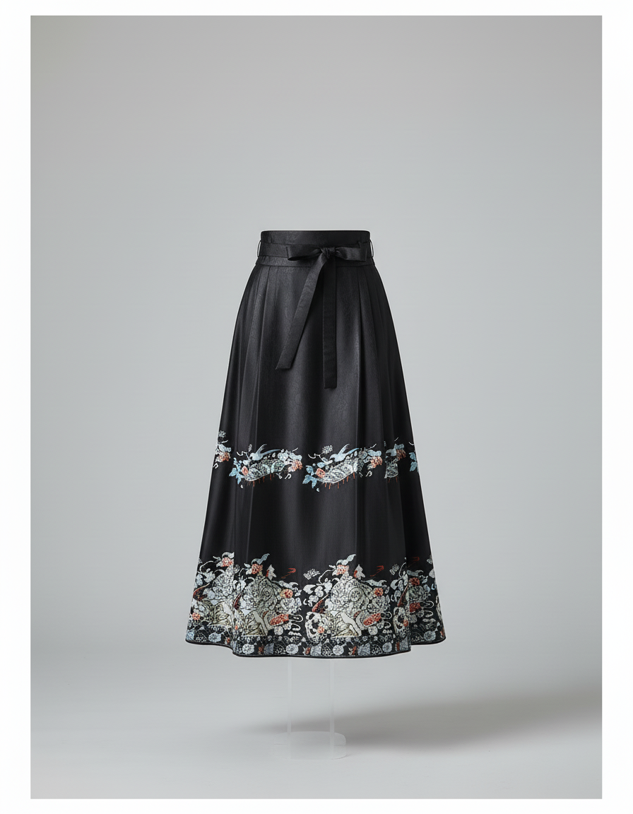 - Couleur : Noire avec un motif imprimé multicolore en bas de jupe.