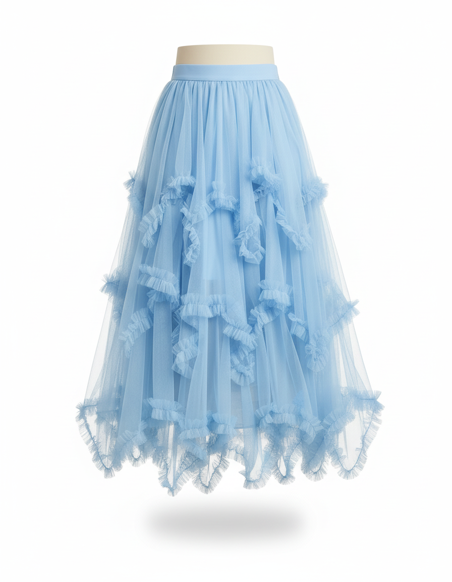Cette Jupe Longue Princesse est un vêtement en tulle de couleur bleu ciel, caractérisée par des volants superposés. Elle présente une coupe longue et une taille élastique.