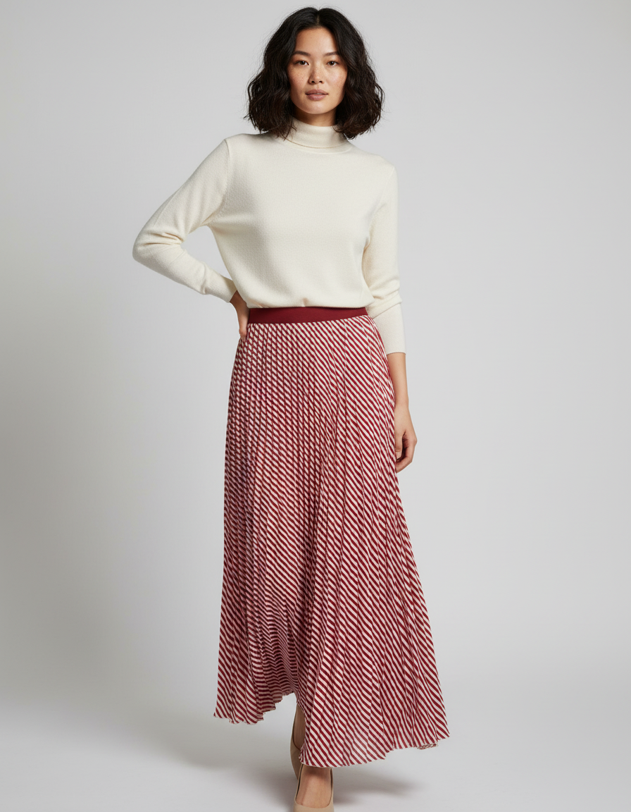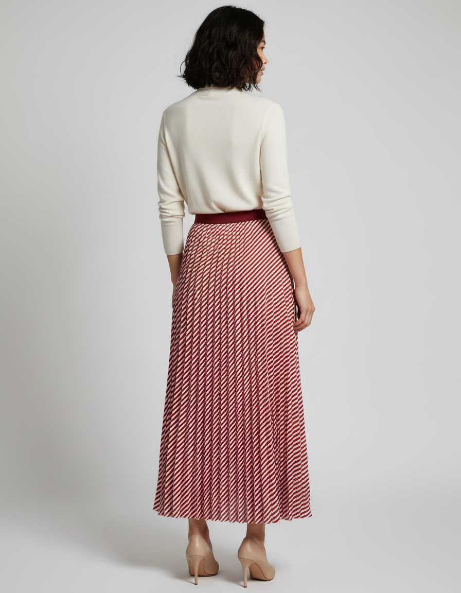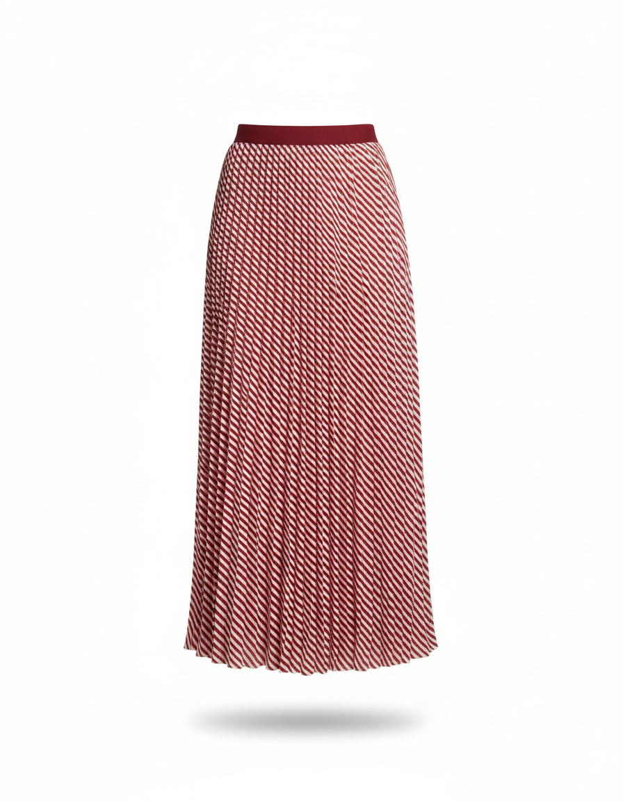 Cette jupe longue plissée à rayures rouges et blanches est parfaite pour une allure élégante et confortable.