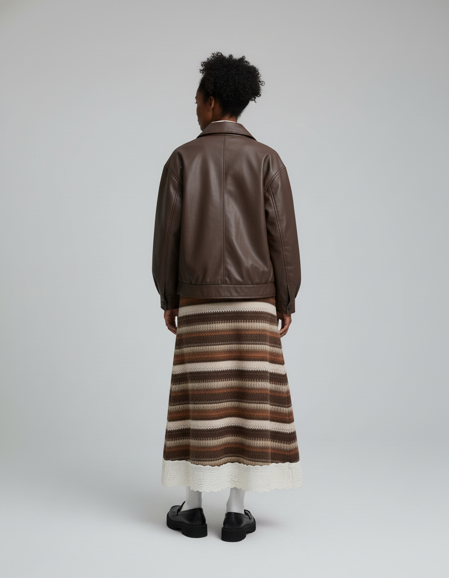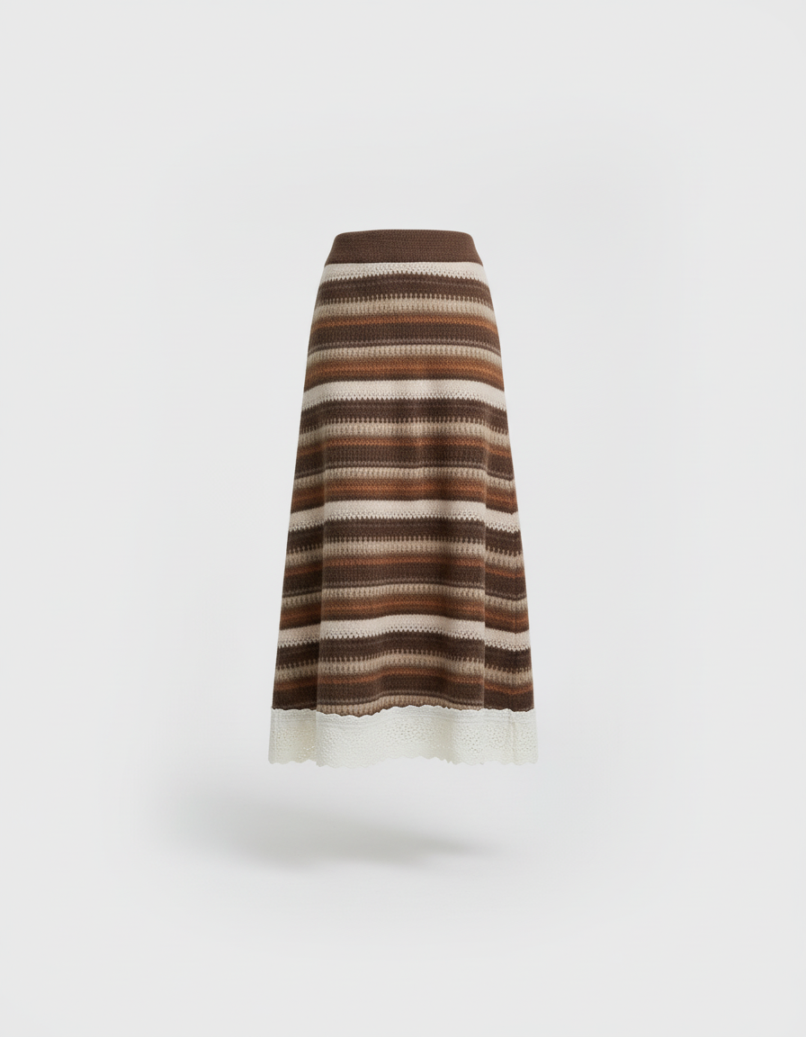 Cette jupe présente un motif à rayures horizontales dans des tons neutres. Une bordure en dentelle blanche est visible sur l'ourlet inférieur de la jupe.