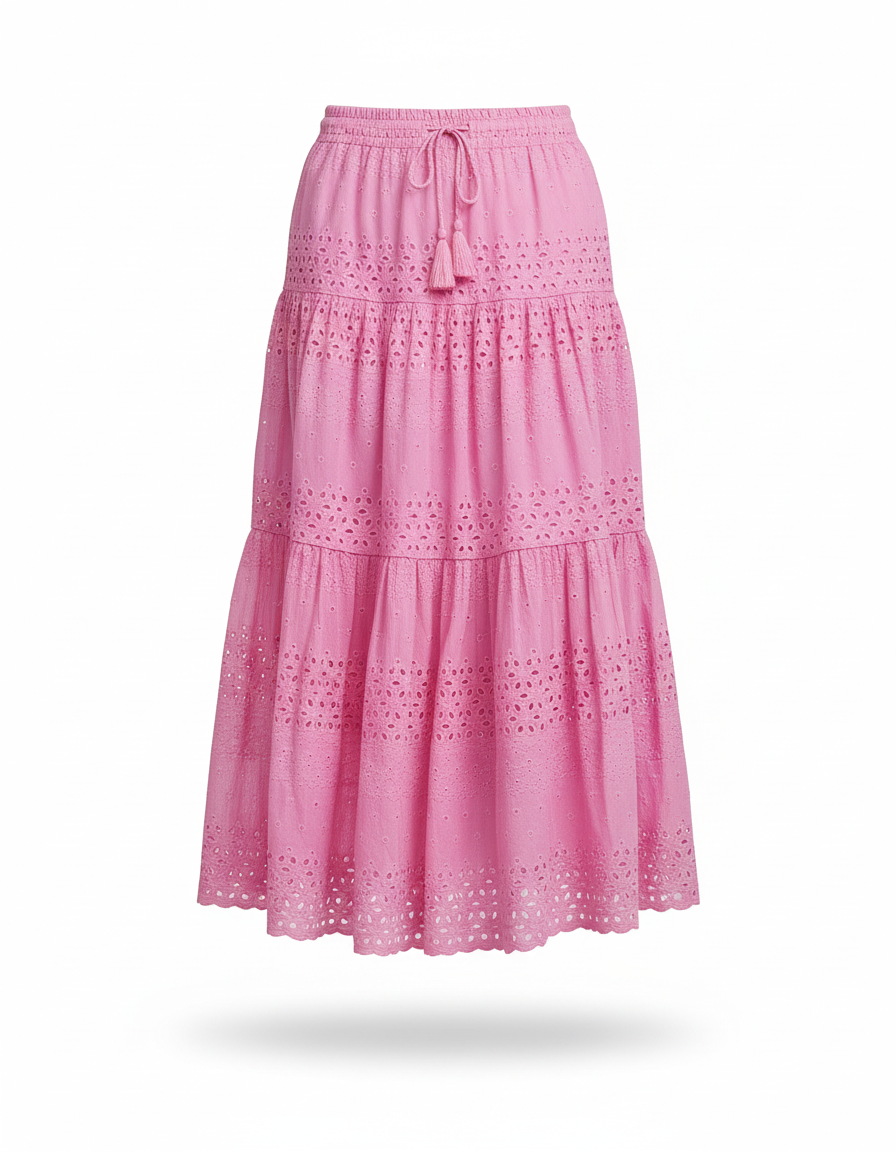 Cette jupe est un vêtement long de couleur rose. Elle présente des motifs de broderie anglaise sur plusieurs niveaux.